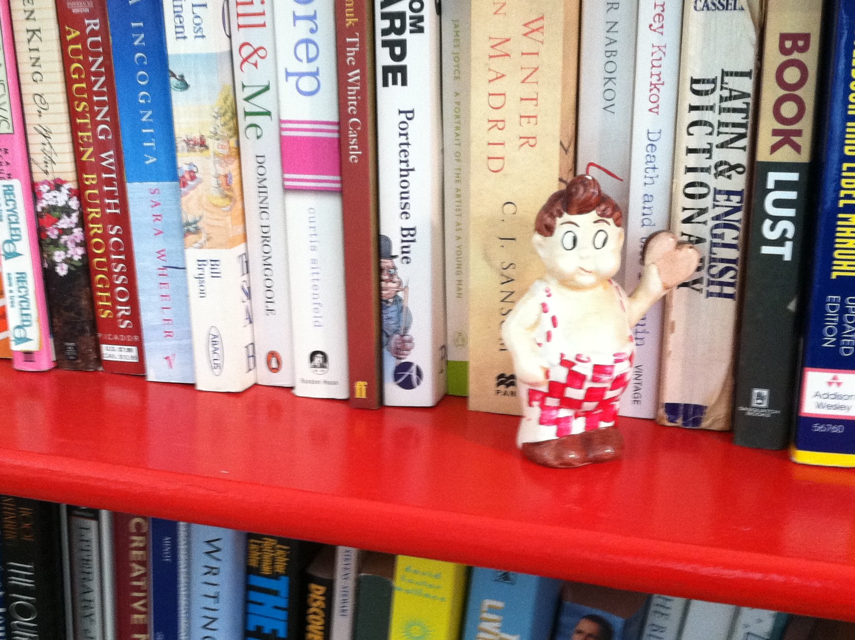 So, for 2012, I’ve been making a few resolutions, ones in honor of my younger self. To write more, to dream more, to be more optimistic. I’ll keep the specifics of those resolutions between myself and that college kid (and maybe hubby, too), but I like the little surge of energy I get from thinking about what this new year could bring, if I follow through with actual elbow grease. I’ll be putting my new Big Boys back up on a shelf in my office – preferably more securely than before – and maybe they’ll help keep tabs on me this year. I think the younger me would be pleased to see my trying. She’d probably even pour me a second cup of coffee, call me ‘Honey’ and offer me an encouraging hug. She was just that kind of girl.