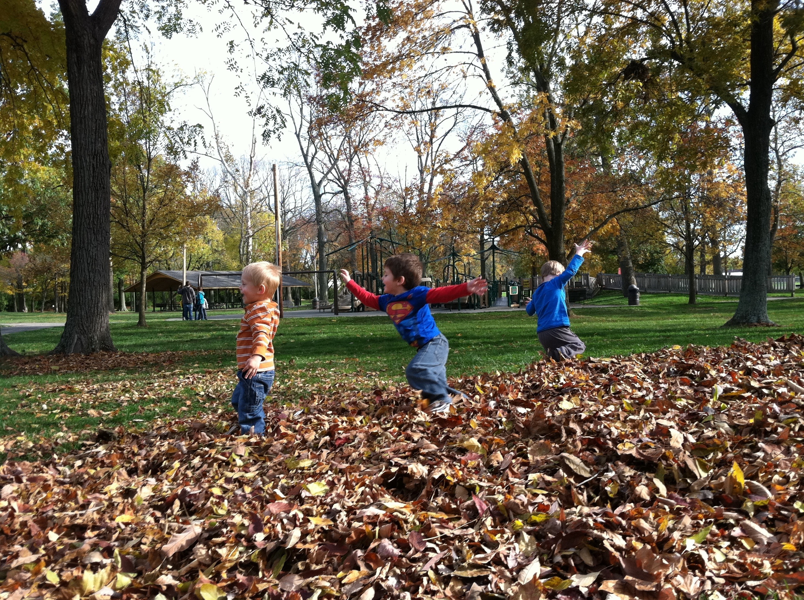 A few weeks ago, we stumbled onto a gigantic pile of leaves in one of our local parks. It was a golden fall afternoon, and Liam and two of his toddler buddies frolicked for the better part of an hour in the foliage. They dove and fell and wriggled and threw and laughed and laughed and laughed. At one point the three of them actually twirled in circles, their arms spread wide in delight. Joy in its rawest form.