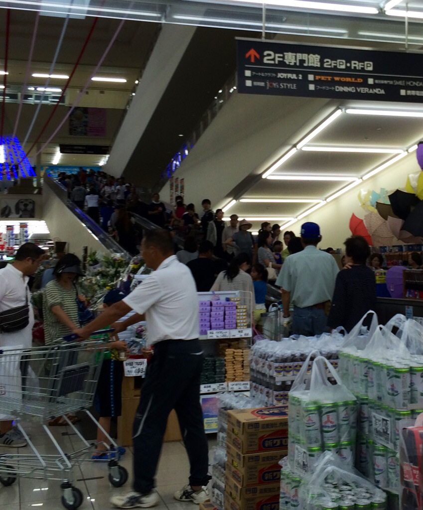 The store is massive. It meanders over two floors, which are accessed by riding up or down a very long, sloped escalator. We navigated our way through a sea of Japanese, browsing through sections selling bikes, fabric, kitchen supplies, outdoor furniture and indoor rugs. We skipped the pet section but many of the customers around us had small dogs tucked into their shopping carts. In the bike shop, Liam had his first experience of being petted by a local. As he sat on one of the bikes, a male clerk approached him with a big smile and kept reaching out to pat his blond hair. Ordinarily, I’d find that kind of interaction a little, um, creepy, but the guy just seemed genuinely happy to meet Liam.