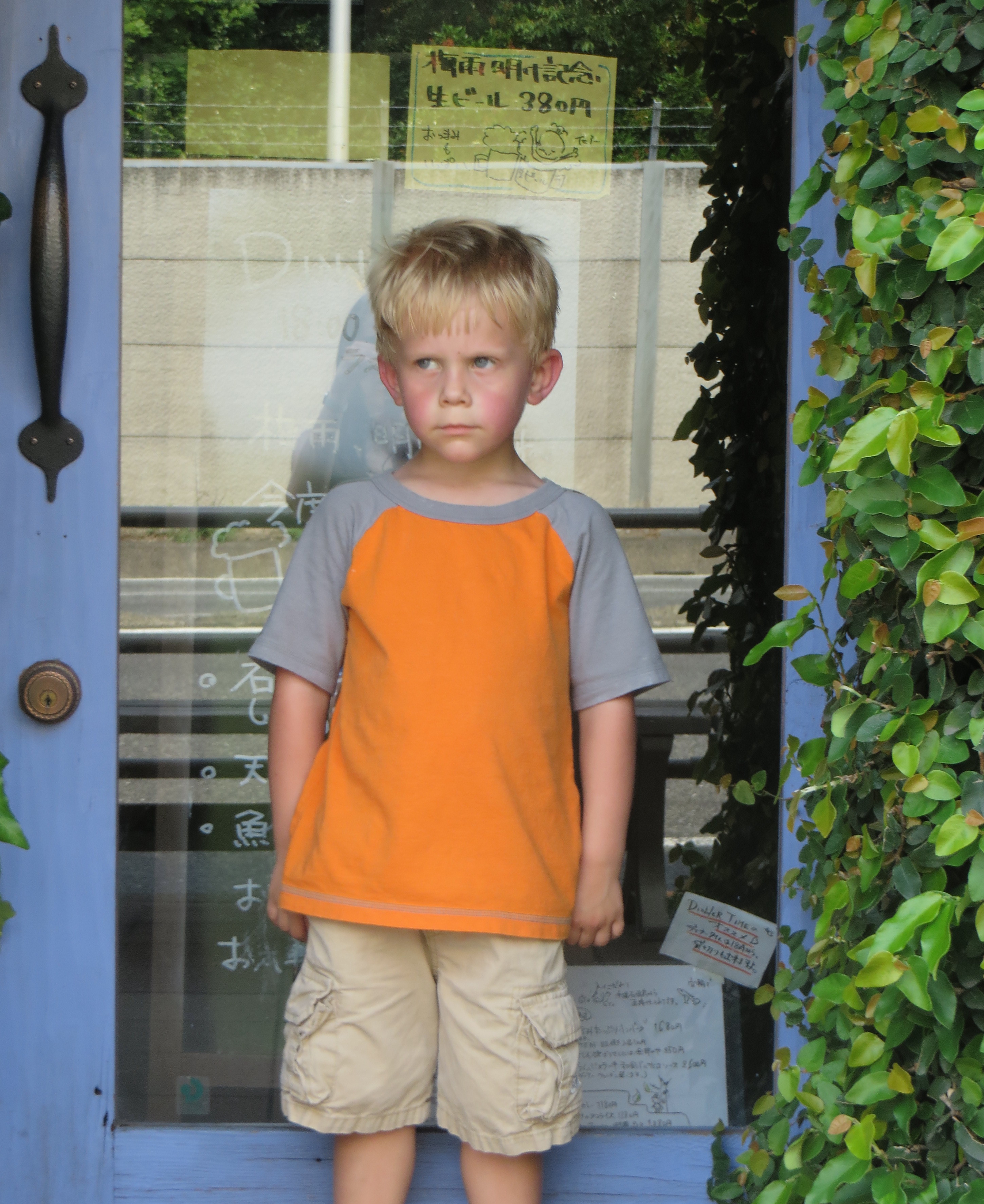 I’m such a newbie to Japan that I can’t place the area around base in any kind of context. Do we have more English signage than elsewhere in Tokyo? Does the variety of restaurants – this stretch includes Thai, Italian and Chinese, not to mention a bagel store – cater to the tastes of the large American population here or is that variety par for the course in Japan? What I do know is that the sidewalk was free of litter, the cars and large trucks barreled by on just the other side of the railing, and that we frequently had to step aside as cyclists rolled by us. The stretch we walked included several antique stores and used clothing shops, mainly offering vintage goods. Communication is still rather tricky for us, but Liam made the clerk in one of the shops giggle by his attempts to greet her with “Konnichiwa!”