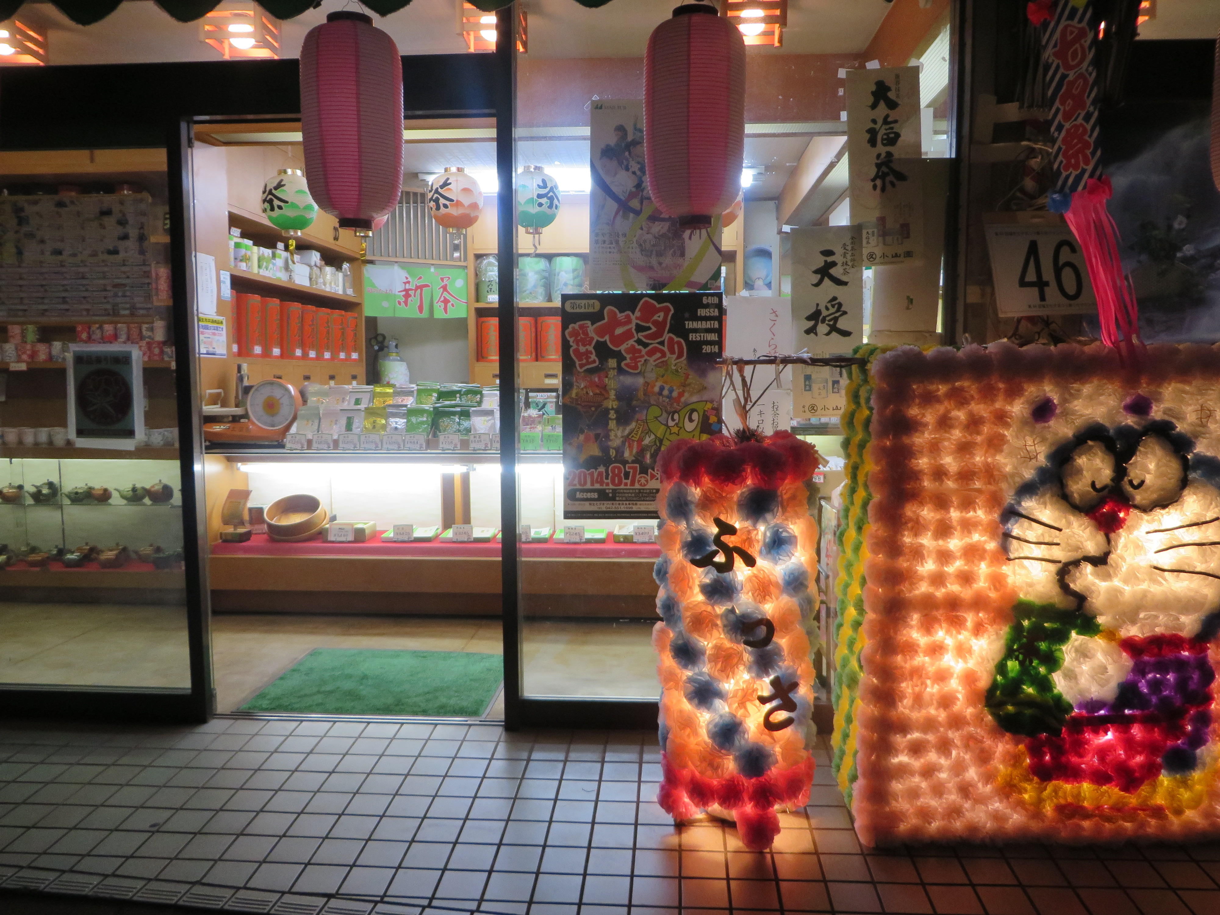 The roads emptied a bit at the edges of the festival and Liam giggled in delight as he tried to leap high enough to catch onto the lantern streamers. At times he was joined by other little kids, forming teams of tiny jumpers. Groups of Japanese gathered here and there in doorways, smoking, laughing. Wil and I savored the chance to walk through a part of Fussa we had yet to explore, noting little bars whose open doors showed piles of shoes and customers kneeling around low tables. The glass walls of a tea shop offered a perfect view into its well-lit interior of shelves lined neatly with teapots and boxes of tea.
