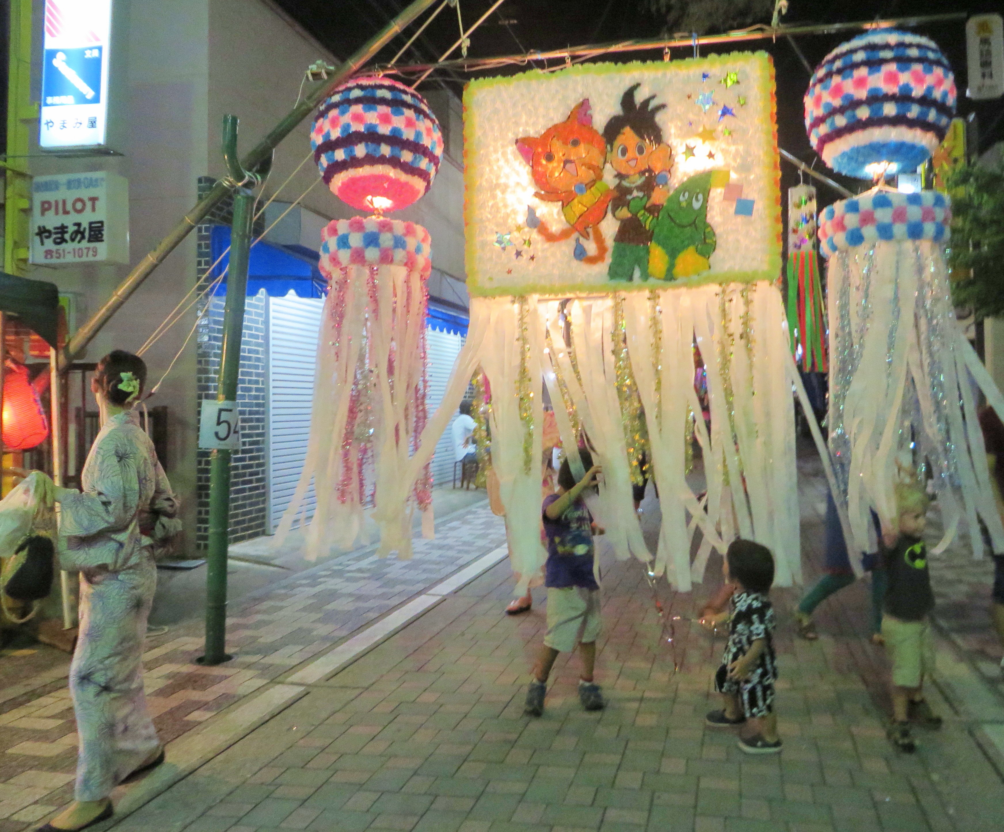 We stretched our legs and walked away from the parade and joined the crowds milling along other nearby, closed streets. The parade would continue on for hours. We were at our first Japanese festival, the Tanabata Festival, which took place here in Fussa last weekend. Friday night’s parade and festivities attracted thousands to the downtown neighborhoods bordering our train station. The streets were decorated from above with colorful banners and lanterns which stretched from curb to curb. Some were comprised of rows of piñata-like objects, shaped into stars or animals or Pokémon-like characters. Others were lit lanterns, their bottom edges trailing rainbow streamers onto the pedestrians below. Some had framed pictures: green aliens in kimonos. Or moving parts: a wave bouncing up and down. On one set of lanterns, I found streamers made of tiny, origami cranes folded from an array of papers.