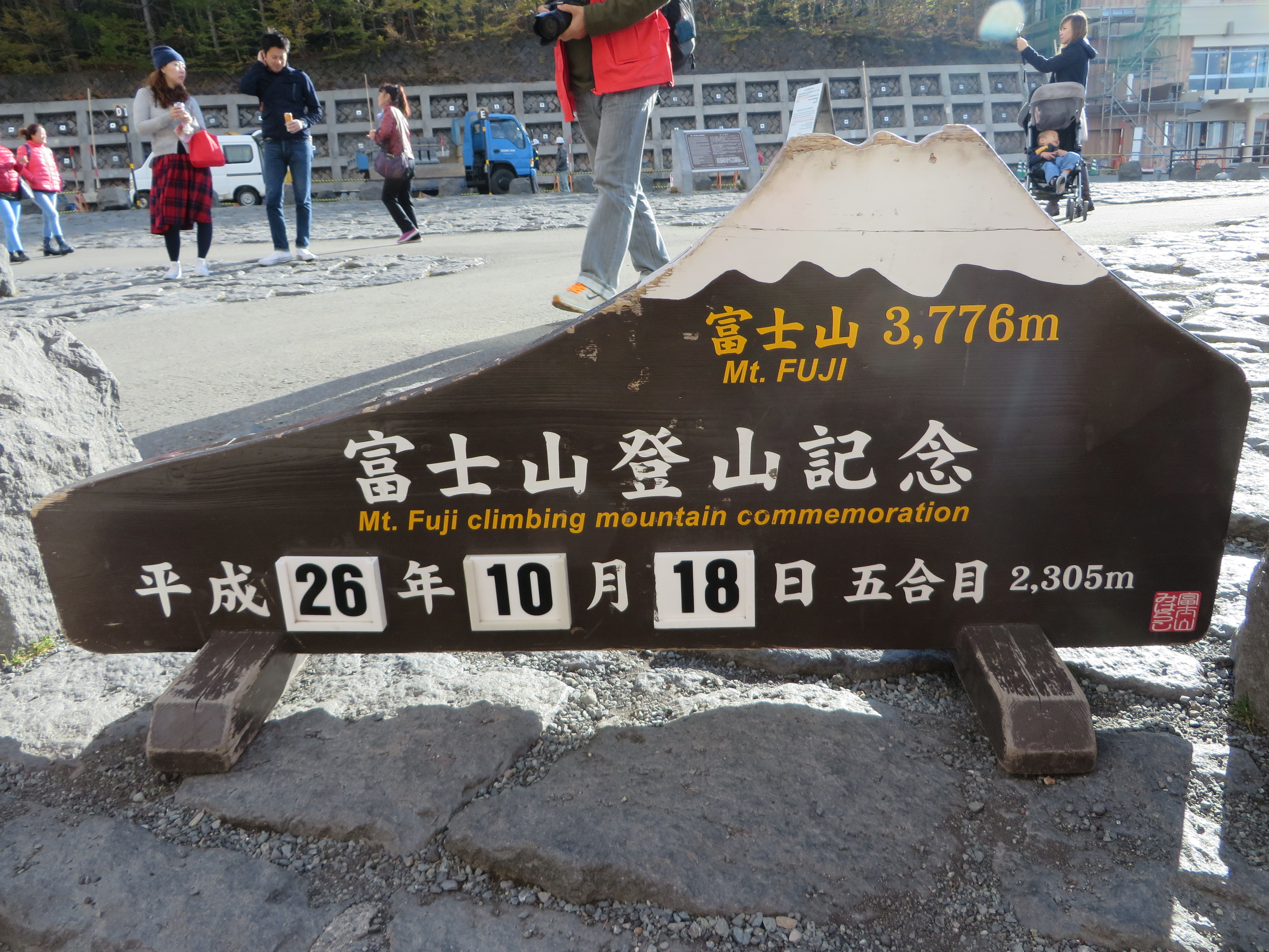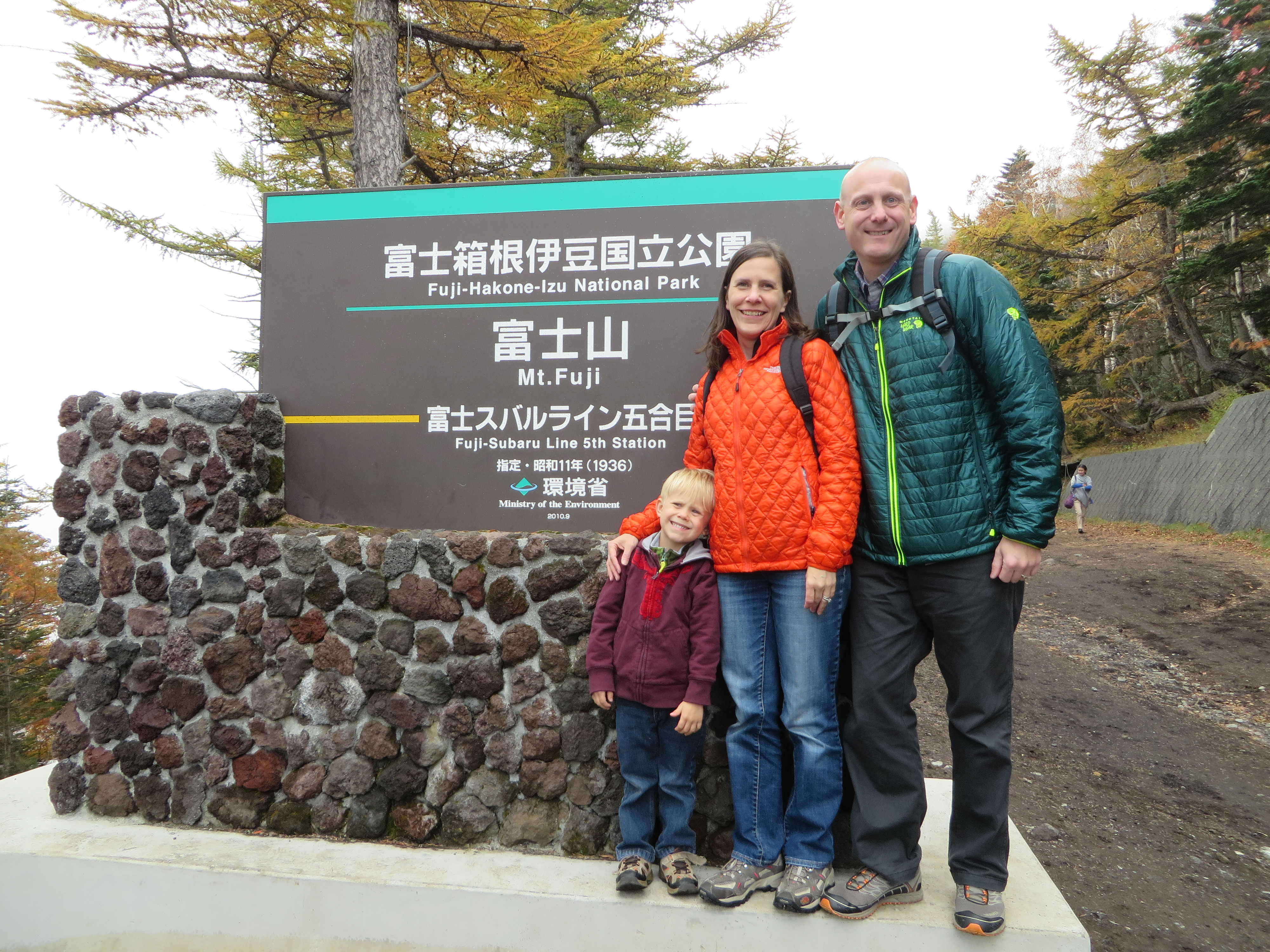We were given just a little over an hour to play on the mountain. We whipped out our winter coats from our back packs and dove into picture-taking. It was our last stop of the day and although Fuji had smiled at us for most of the ride, she played coy once we landed on her lap, hiding behind mist and clouds. Perhaps because of her absence, the other tourists decided to turn their cameras on us. A Japanese man holding a small dog approached me and asked if he could have a picture. I’ve never been approached for pictures – my brown hair isn’t exactly exotic — so I assumed he meant he wanted me to take a picture of him and his wife (and the dog.) Nope. He wanted Wil (blond, what’s left of it), Liam (very blond) and me (not at all blond) to stand in front of a Mt. Fuji sign with him and his dog. We obliged. Why not? After that, a kind Japanese man offered to take a picture of all of us, without the stranger and his dog, and we may now have this year’s Christmas card picture ready. Later, we exchanged greetings with Chinese tourists who decided we should be the highlight of their Fifth Station video.