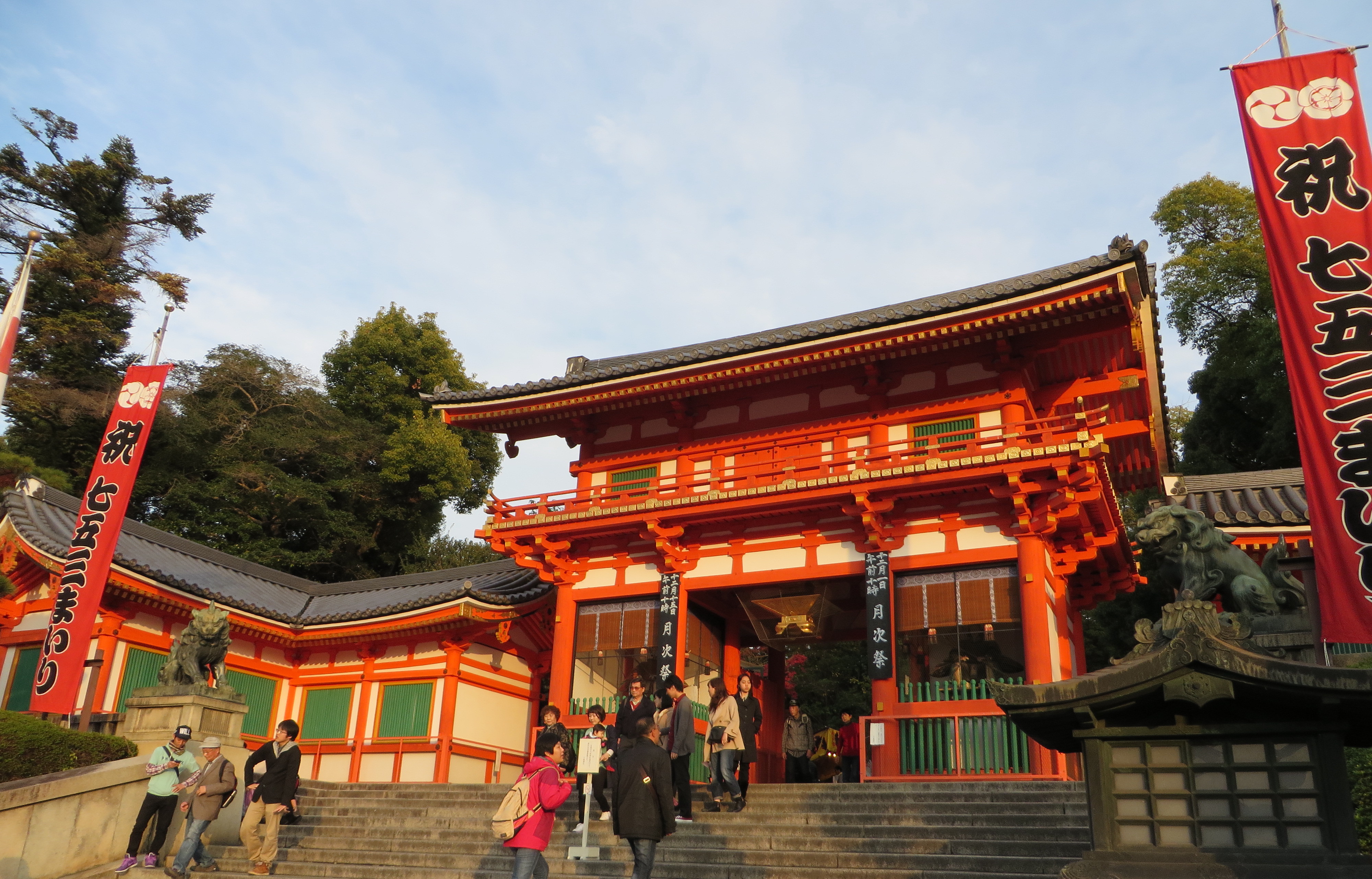 Next, we walked to the Yasaka Shrine, which was just a short stroll downhill from Kodai-ji. (Did I mention that Kyoto is basically just one giant temple-shrine?) In the late afternoon, this large Shinto shrine was a popular spot. This shrine has a long history: I’ve read that it was originally founded in 656, dedicated to the god Susa-no-o, the god of good prosperity and health, and his wife and eight children, although the current buildings were constructed in 1654.