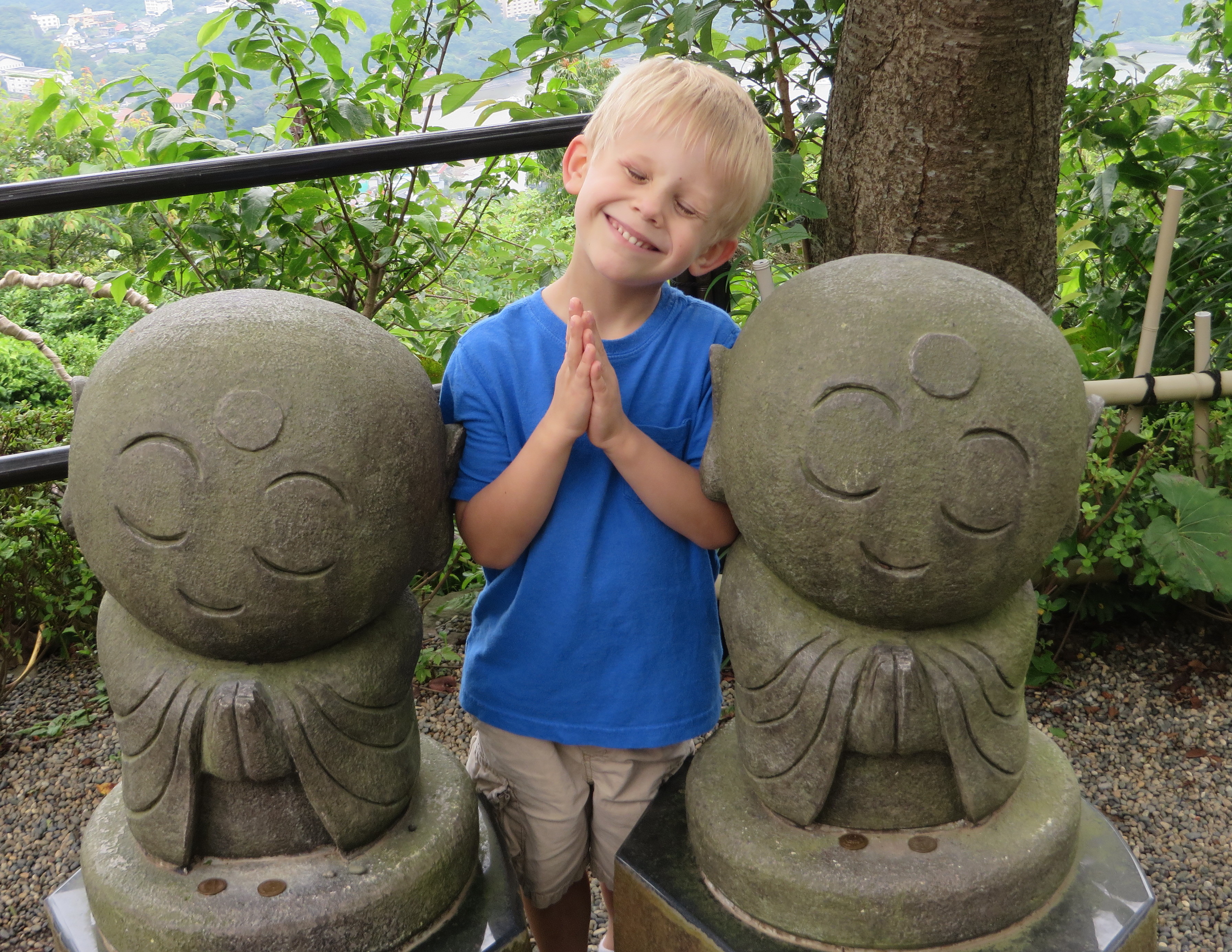 The next morning, the weather cleared and we walked to the Shimoda aquarium, where we spent a few hours. Liam carried a cartoon map one of the hotel staff had given him and he carefully navigated us into Shimoda, looking out for the landmarks drawn on the map. He took his role very seriously. By the time it started raining again at 3:30, we’d explored a good bit of the city. We climbed hills; smelled beautiful hydrangeas; visited temples, including Ryosen-Ji Temple where Commodore Perry signed the Shimoda Treaty — opening up the port to American ships — in 1854; ate ice cream; and rode a cable car up Mt. Nesugata.