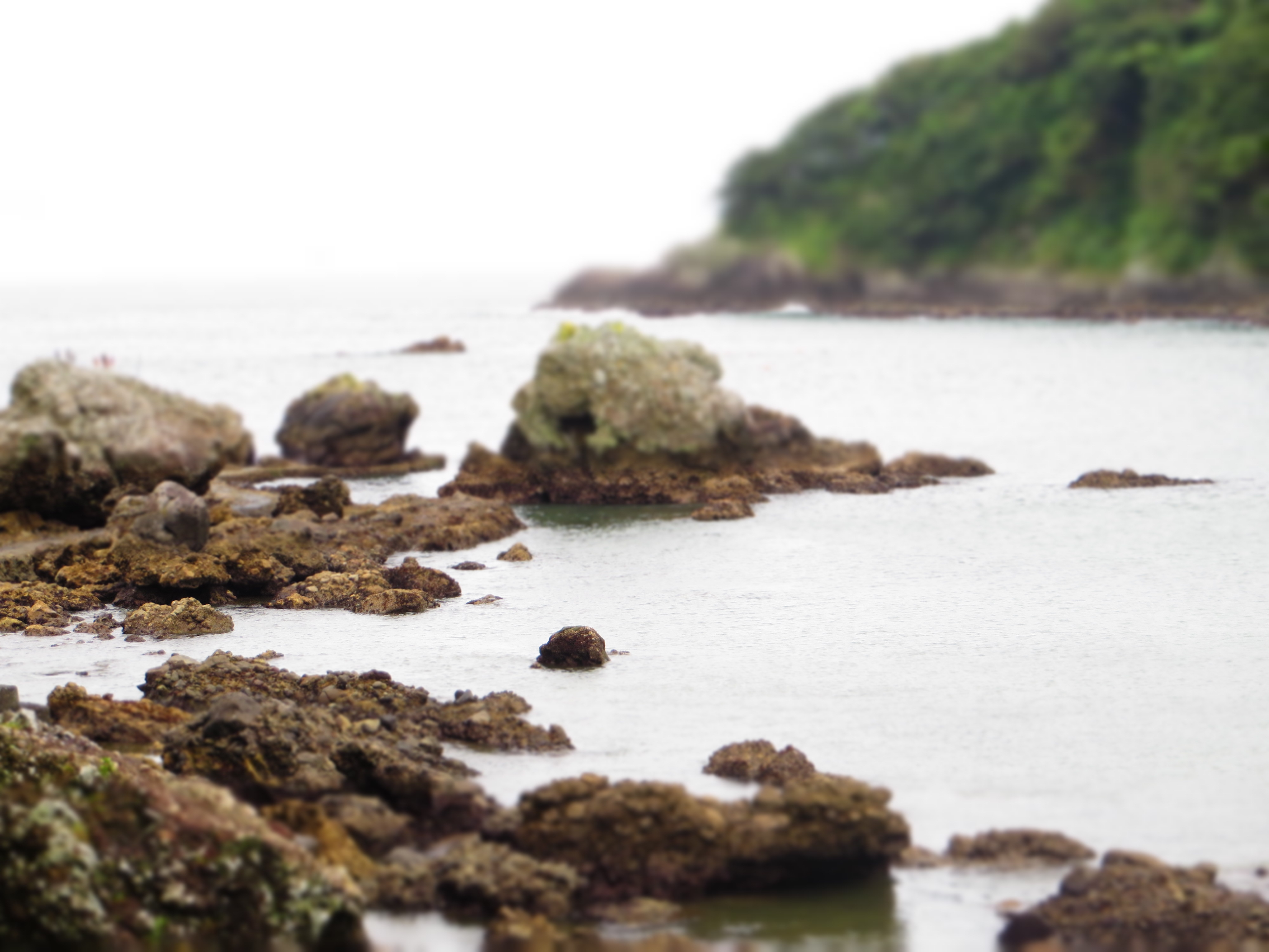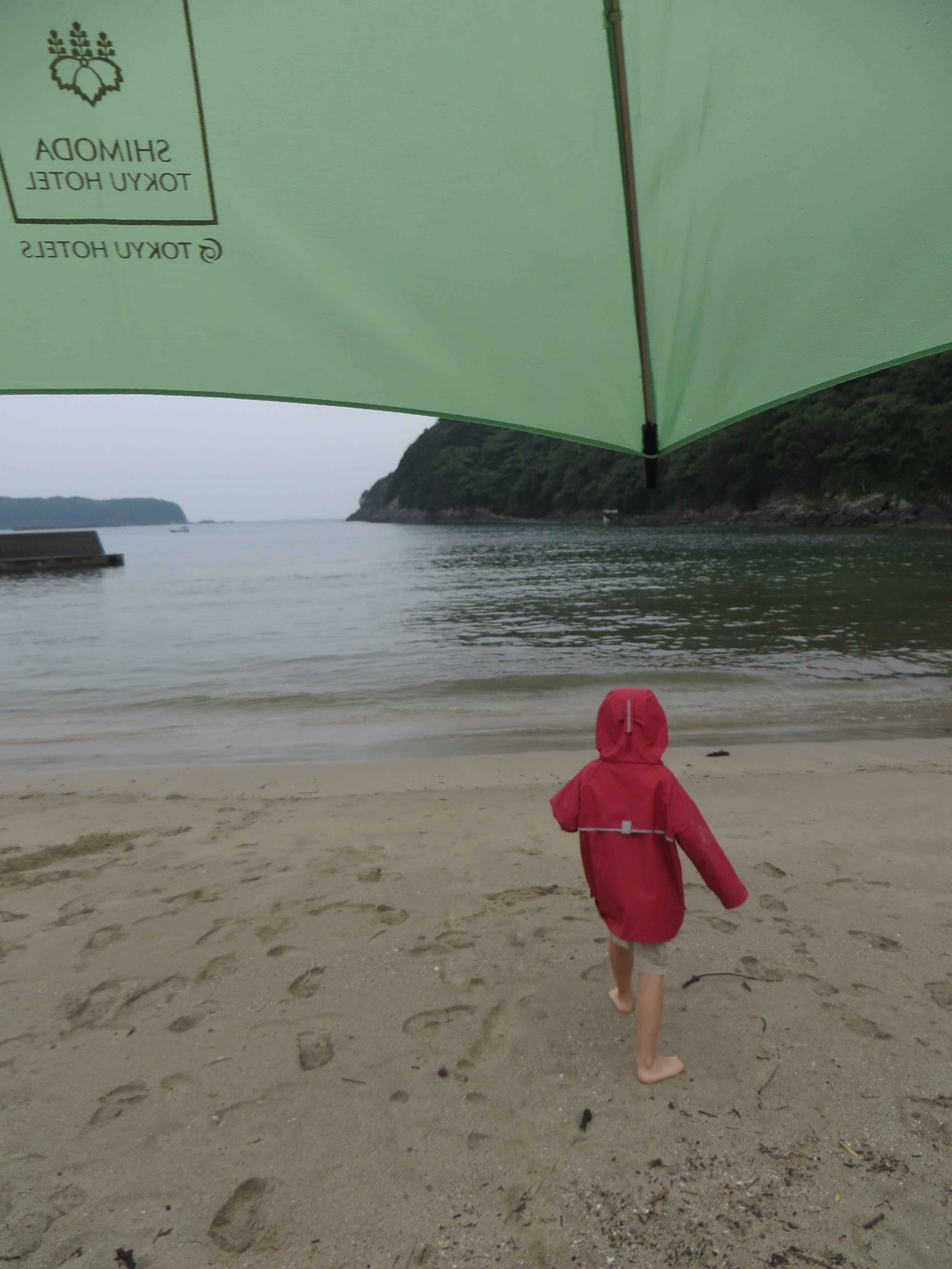 The deluge softened to a light drizzle by the time we checked in to Tokyu Shimoda hotel, on the Izu penninsula. It was time to explore. We threw on our rain coats and ventured down the seaside hill the hotel sits atop. Crabs scuttled as we descended the hotel stairs down to the coast. Liam hurried me onward. He wasn’t bothered in the least by the stormy skies.