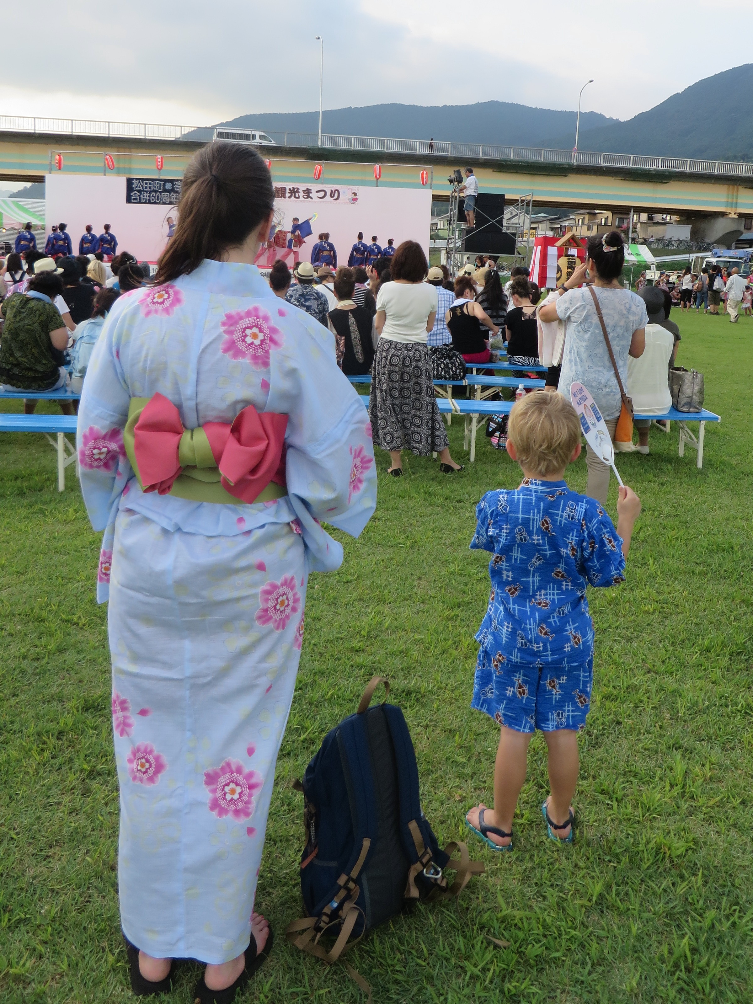 Our Japanese guide, T, met us at Shinjuku station in central Tokyo. For much of the next seven hours, she would be at our side, helping to explain the traditions, translating as we interacted with locals and playing tirelessly with Liam, who quickly formed a bond with her. We started our official visit with a light lunch at the Matsuda city hall, where the mayor greeted the 25 or so foreigners with a brief speech. After lunch, we were ushered into changing rooms. Wil was dressed in a two piece jinbei and I was able to pick out a lovely yukata – a summer kimono made out of cotton instead of silk. A posse of older Japanese ladies fussed over me, wrapping and tying – tightly! – me into the dress, speaking rapid fire Japanese. (For all I know, they were saying: Suck in your gut!) They were all very sweet.