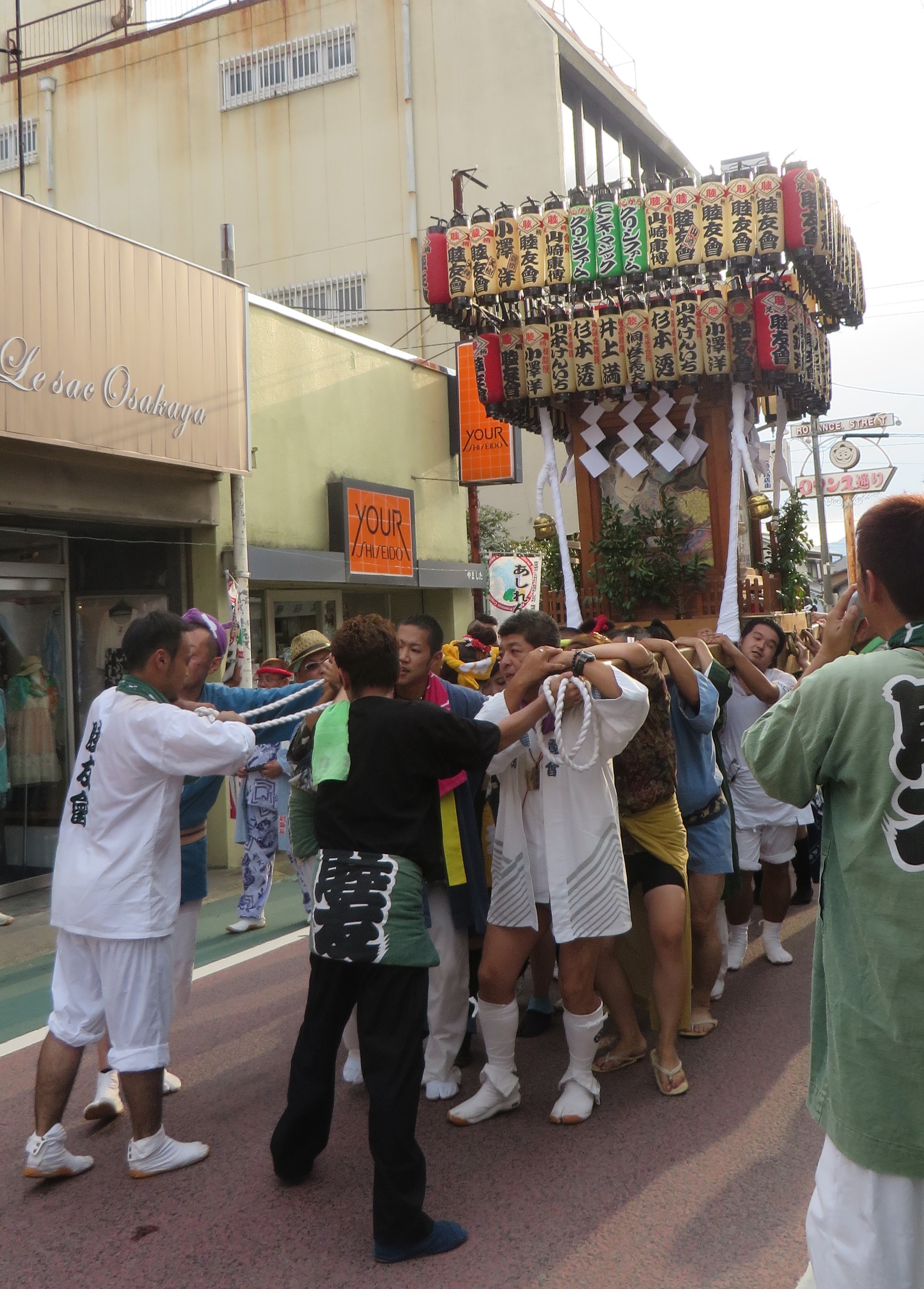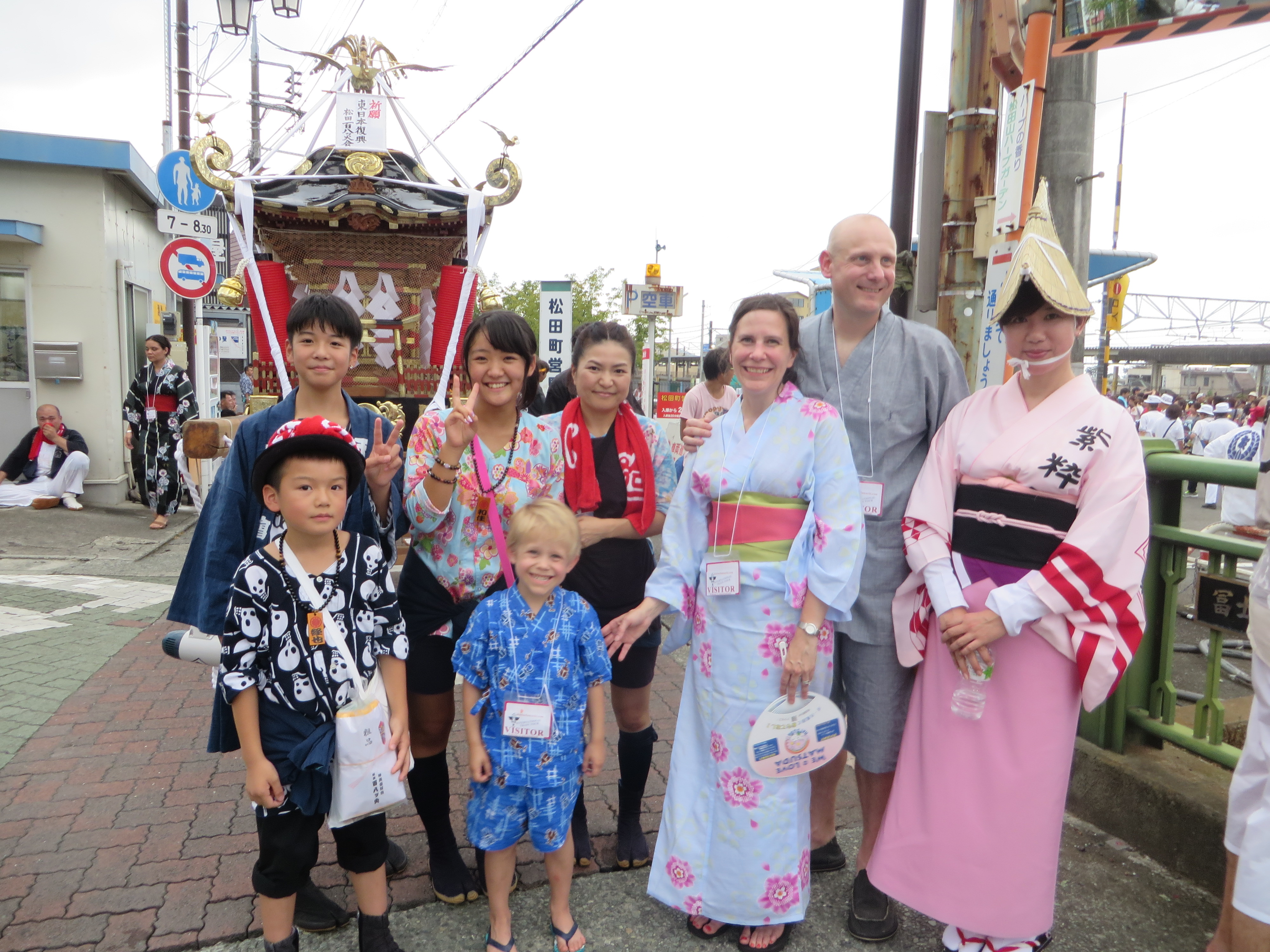 This Saturday, we experienced the delights of another beautiful Japanese festival. All well and good, but the kindness given to us by strangers throughout the day was what really made the day special. We were guided by train, fed and watered, dressed and gifted with traditional Japanese garb, photographed, and encouraged to enjoy a parade, a festival and fireworks. Wil and Liam were even given a rare opportunity to carry a portable shrine.