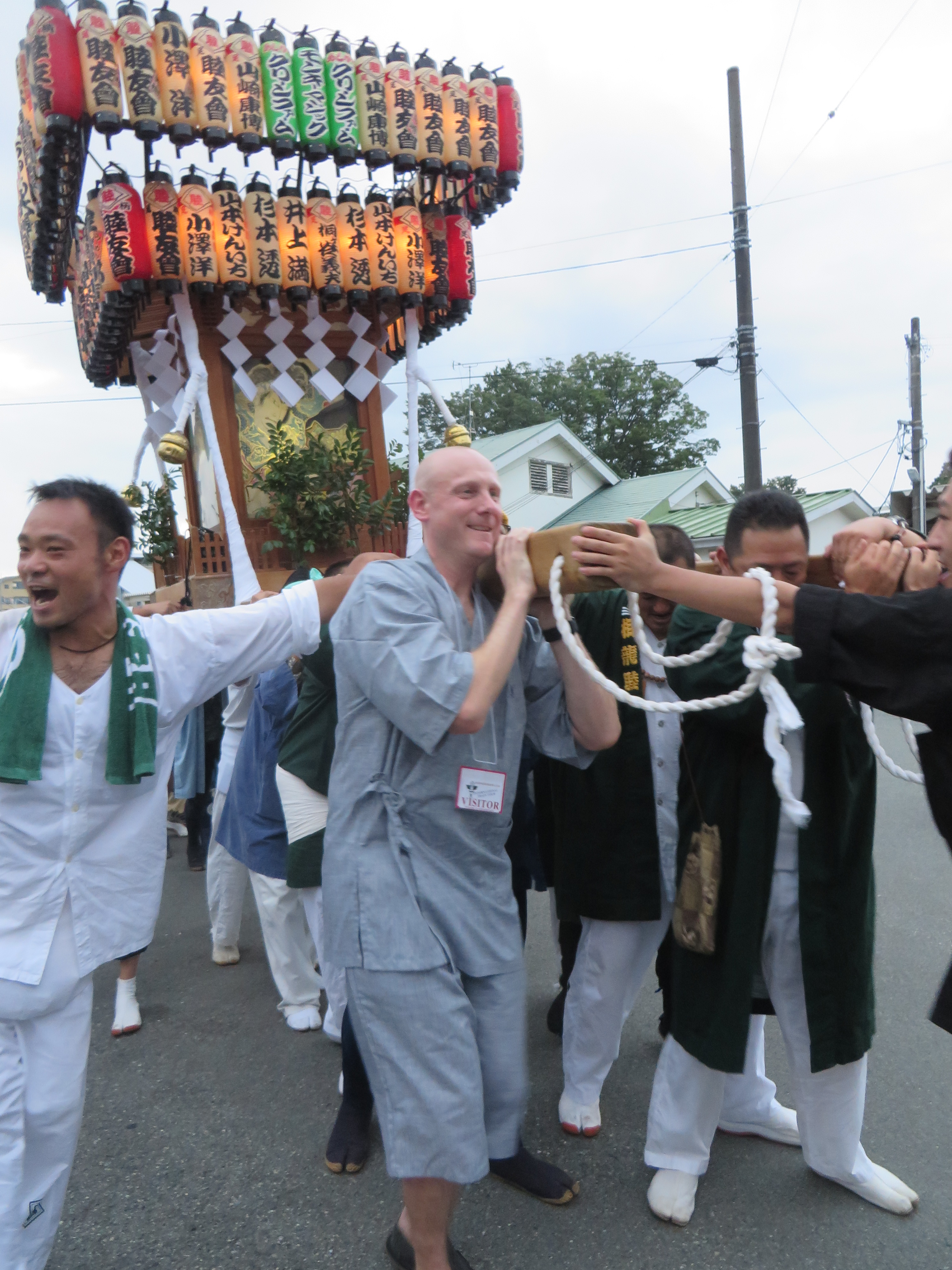 I learned later that it is impolite to ask how heavy the mikoshi are since they are, in essence, sacred vessels for carrying deities – I was told the answer in confidence – but suffice it to say that they are extremely heavy. Wil only carried it for a few minutes, but he has the black and blue marks on his shoulder to prove it. T told us he should feel quite honored. The teams work closely together and are very tight-knit communities. For him to be asked to join, even briefly, was an honor.