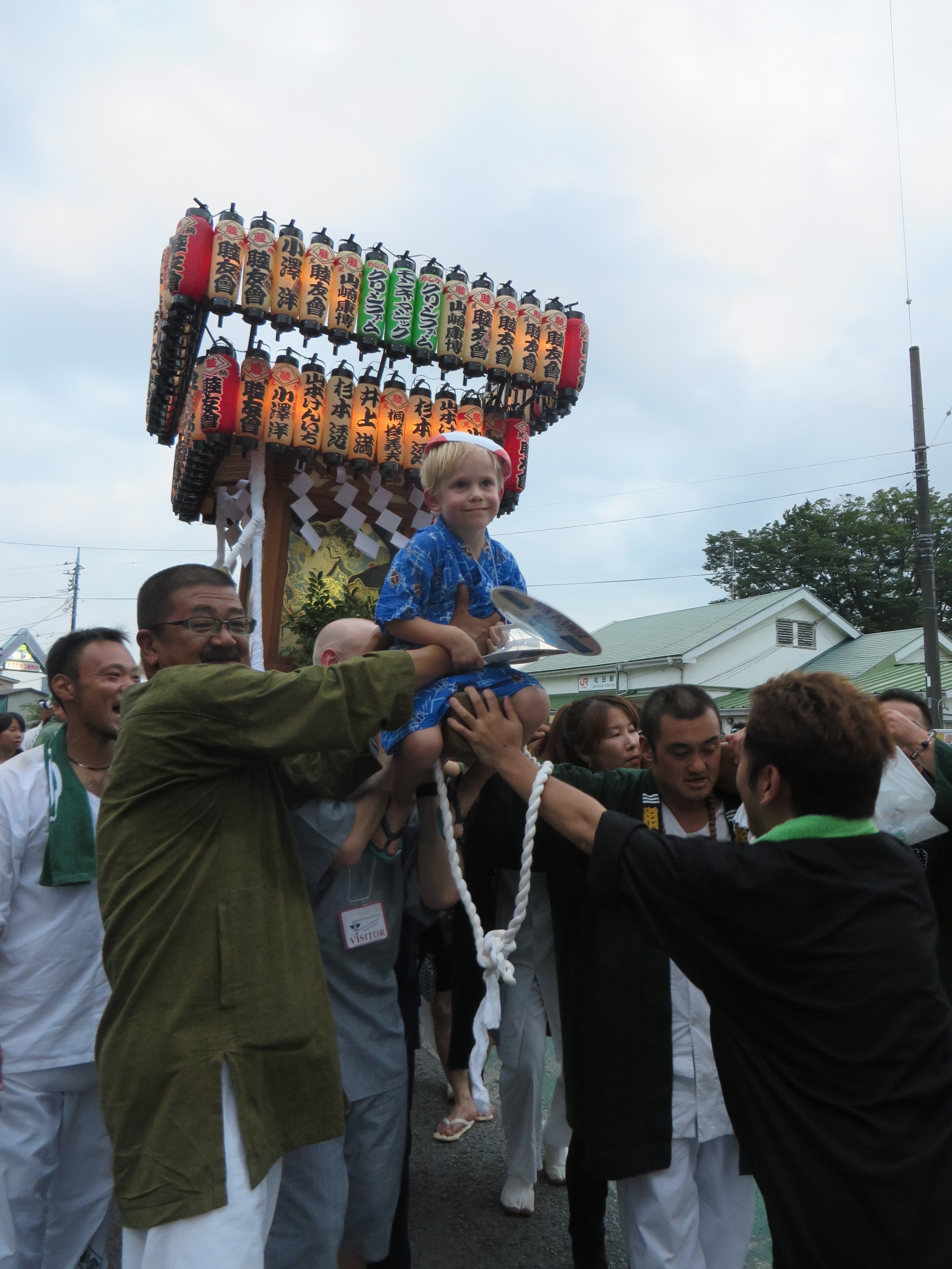 Liam was soon the pet of a gang of half-a-dozen kids affiliated with one of the mikoshi carrying groups. They were all a little older but happily played games with him and a paper fan, allowing him to ‘stab’ them while they each took a turn getting wounded. He was in heaven.