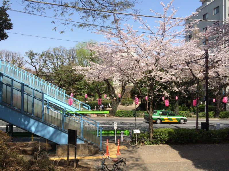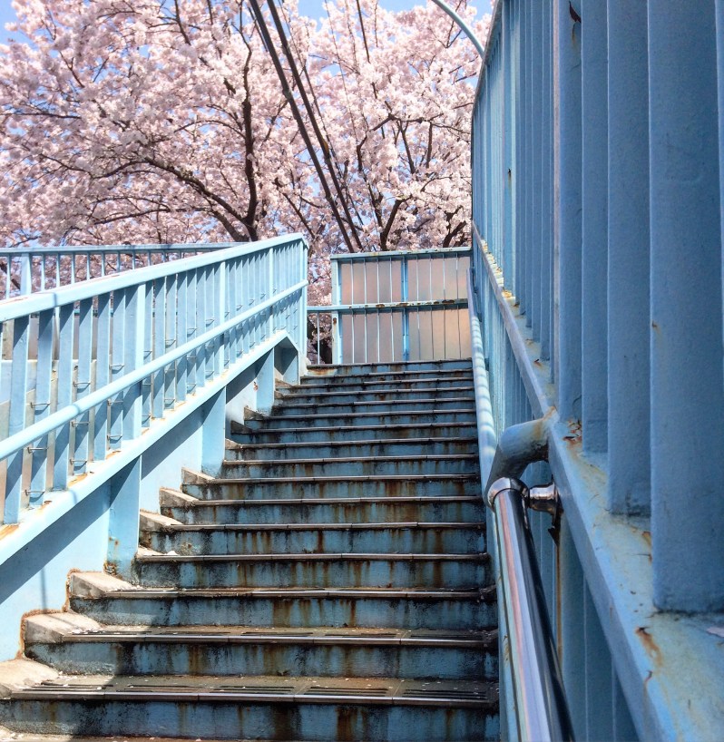 The road has a few pedestrian bridges. I liked the pastel blue with the pastel pink of the sakura.