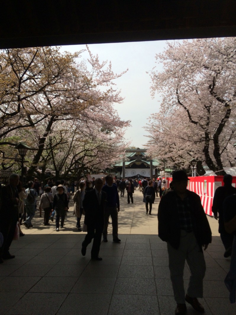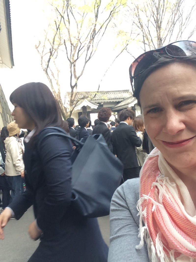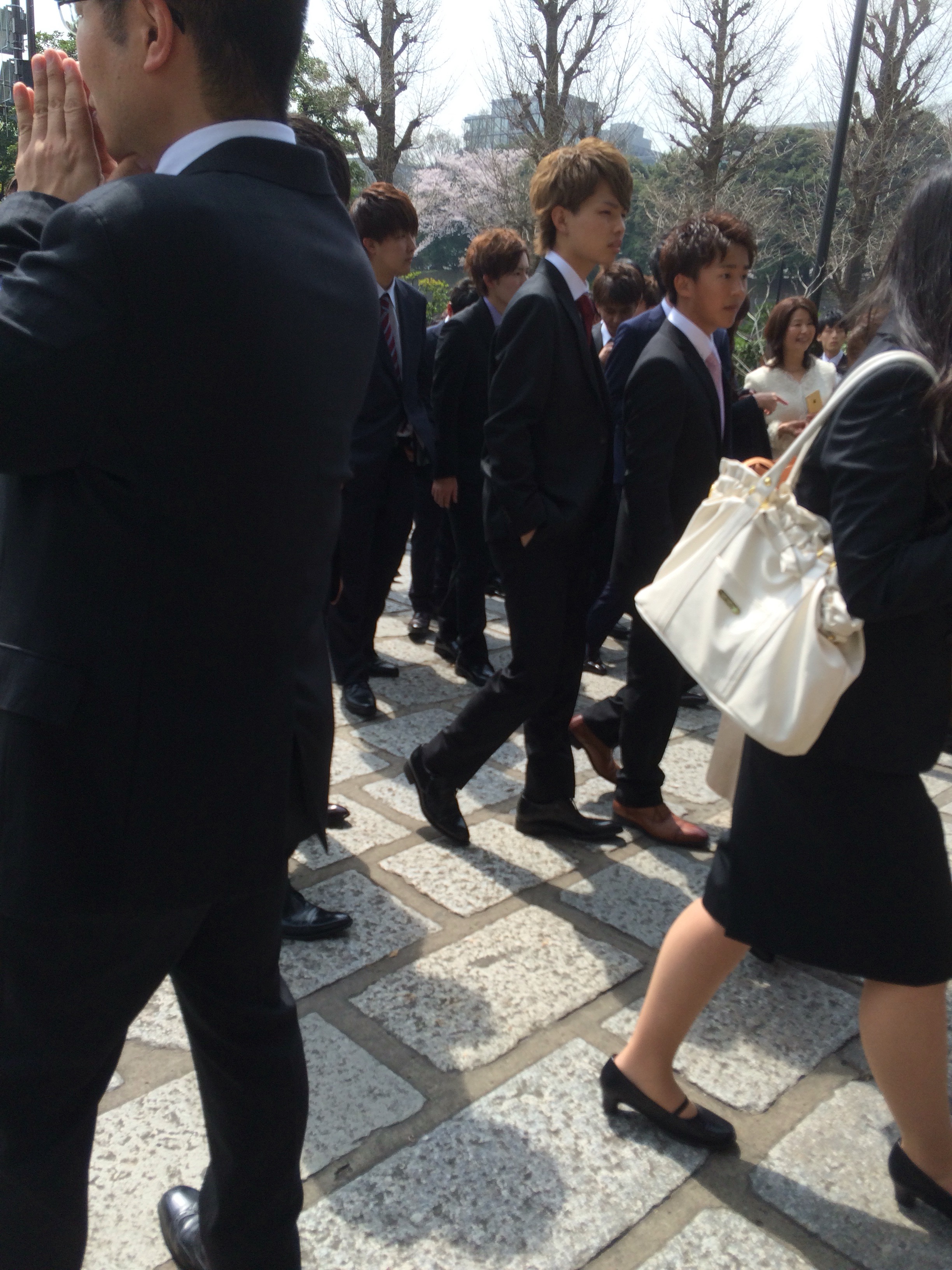 As I walked deeper into the park I began to feel very underdressed. I was packed into a crowd of young Japanese men and women, all dressed in black suits. Uniformed men were using bull horns to direct the crowds.