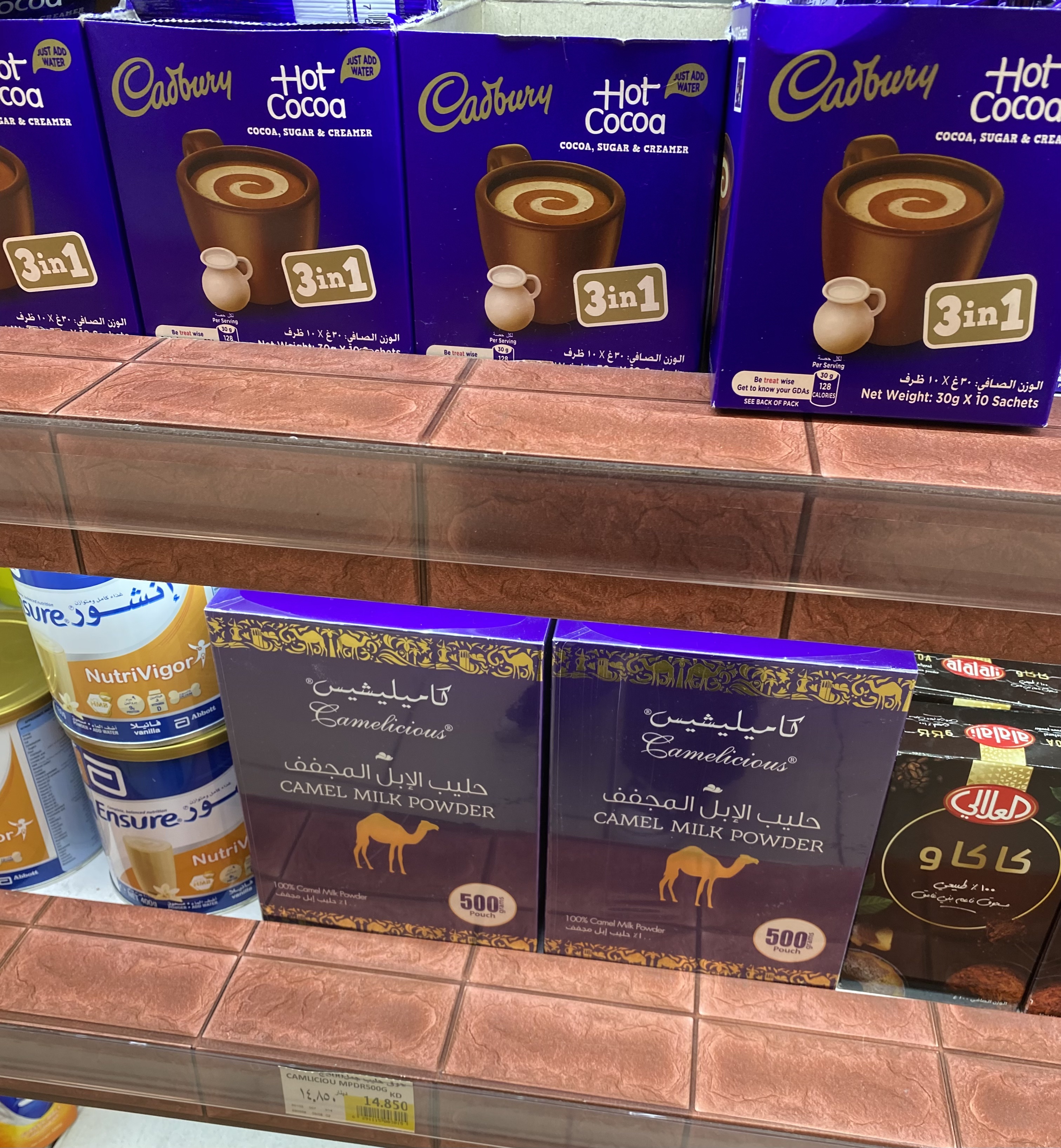 Almost all of the stores we’ve visited have many Indian and Filipino foods and brands available, since those are large expat populations here, as well as a large array of British goods. (I mentioned the candy aisle earlier – Hello, Dairy Milk and Flake!) There are large arrays of figs, dates, dried fruit and nuts behind counters. You can buy pineapples from India or Kenya, Saudi beetroot, or mango from Egypt, with the origin of all fresh fruit and vegetables on display. Rice is on offer in gigantic sacks lining an entire aisle. In the dairy aisle, labneh–a kind of yogurt cheese–takes up half the aisle. (It’s also sold in jugs that look suspiciously like milk jugs, so it’s good to pay attention.) No pork products and no alcohol available, to adhere to Islamic rules, but we do see beef bacon and non-alcoholic beers and mixers. We get a little giddy, to be honest, as each aisle unveils something a bit new and different.