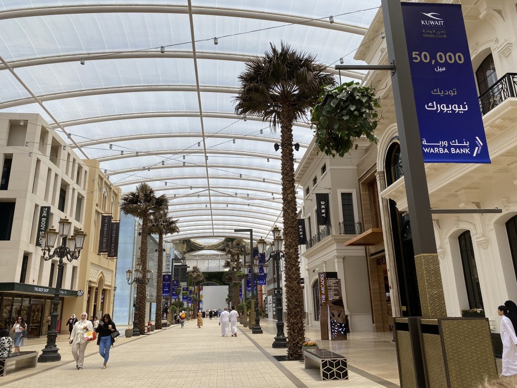 But here it is a little different story. The mall-of-malls in Kuwait City is The Avenues, which is one of the largest in the world. (At some point I will do a post just on this single mall.) It has more than 1,100 stores. That is not a typo. Eleven-hundred. There are 1,100 stores spread out over 12 districts, each with its own theme and style. We can pretend we are in an authentic souk, with winding lanes, traditional restaurants and coffee shops, and shops filled with rugs, robes, and tea services. Elsewhere, a high-end street displays Gucci bags and designer dresses, fancy enough I’m not comfortable crossing over their thresholds. Another lane features shop facades and palm trees that capture the feeling of being downtown in a city. Kids can even go ice skating at a small rink in one of the kids’ zone attractions.