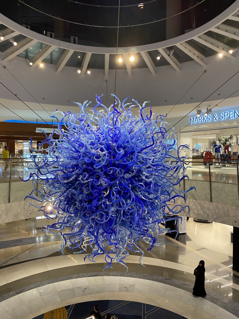 Now, take that mall, multiply it by at least 10, design each section distinctly—one like a souk, one like Rodeo Drive, one like a children’s amusement park, etc.—add in several rotundas that nearly rival that of the British Museum Library, throw in some Dale Chihuly glass sculptures, dozens of restaurants with what I’m calling (ma)al fresco dining since they are indoors but feel outdoors, and you’re getting close to the opulent indoor extravaganza that is designated as a “mall” in Kuwait.