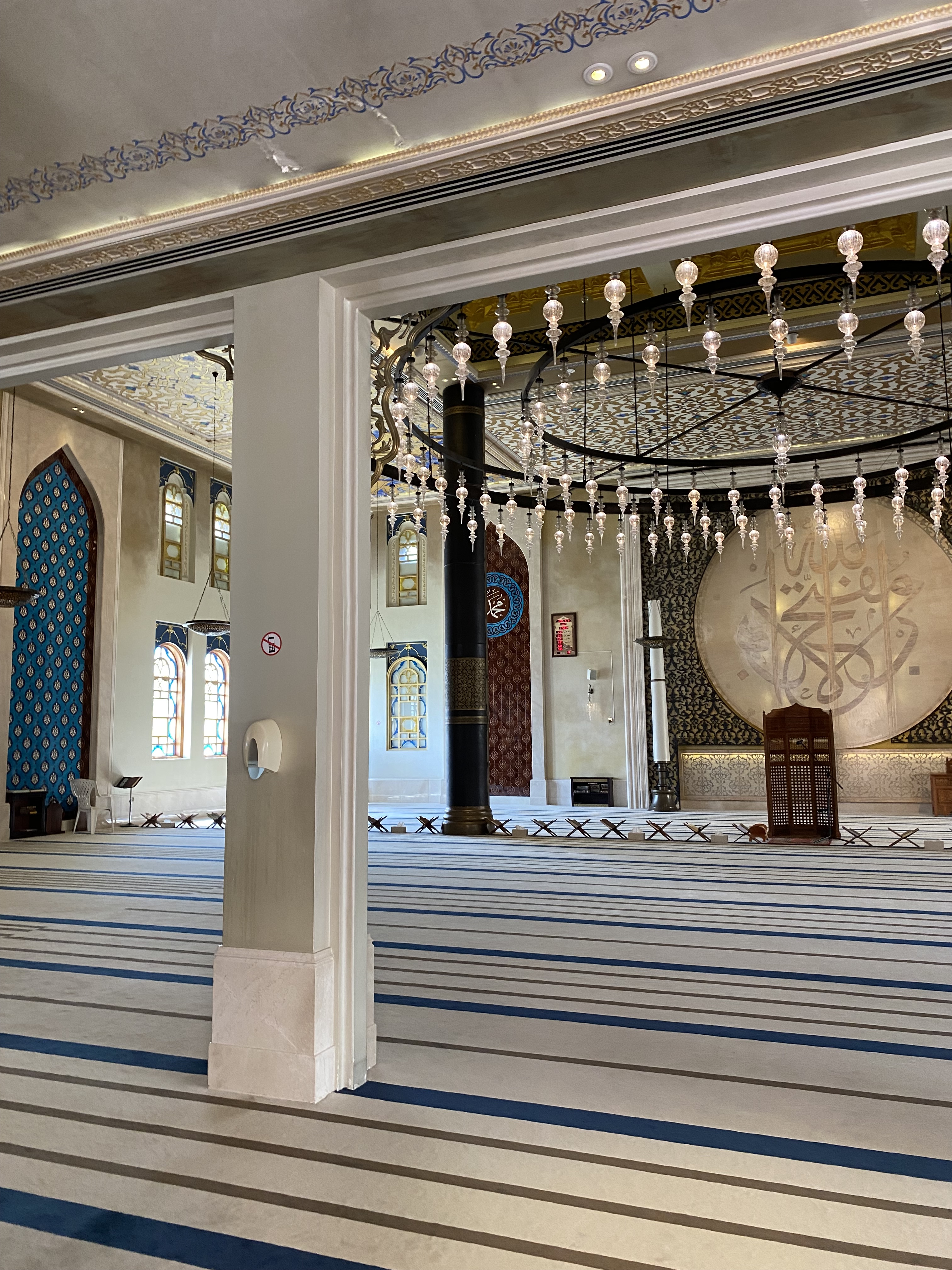 We chatted a bit about her faith before she led me, and another visitor, into the main prayer hall (Musalla). The guide was deep in conversation with Wil and Liam and included the rest of us in his remaining talk. He demonstrated the posture for praying, showed us a copy of the Koran, and highlighted basic Islamic theology. It was the first mosque we’ve been inside since moving to the Middle East, and I appreciated the kind and open welcome.