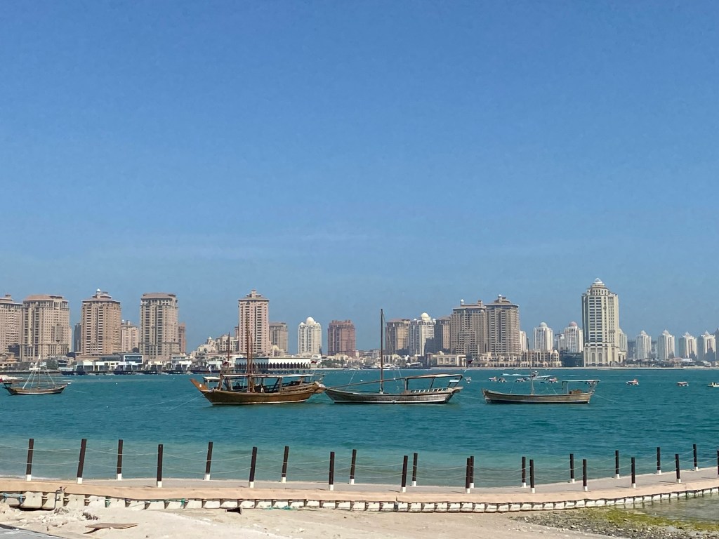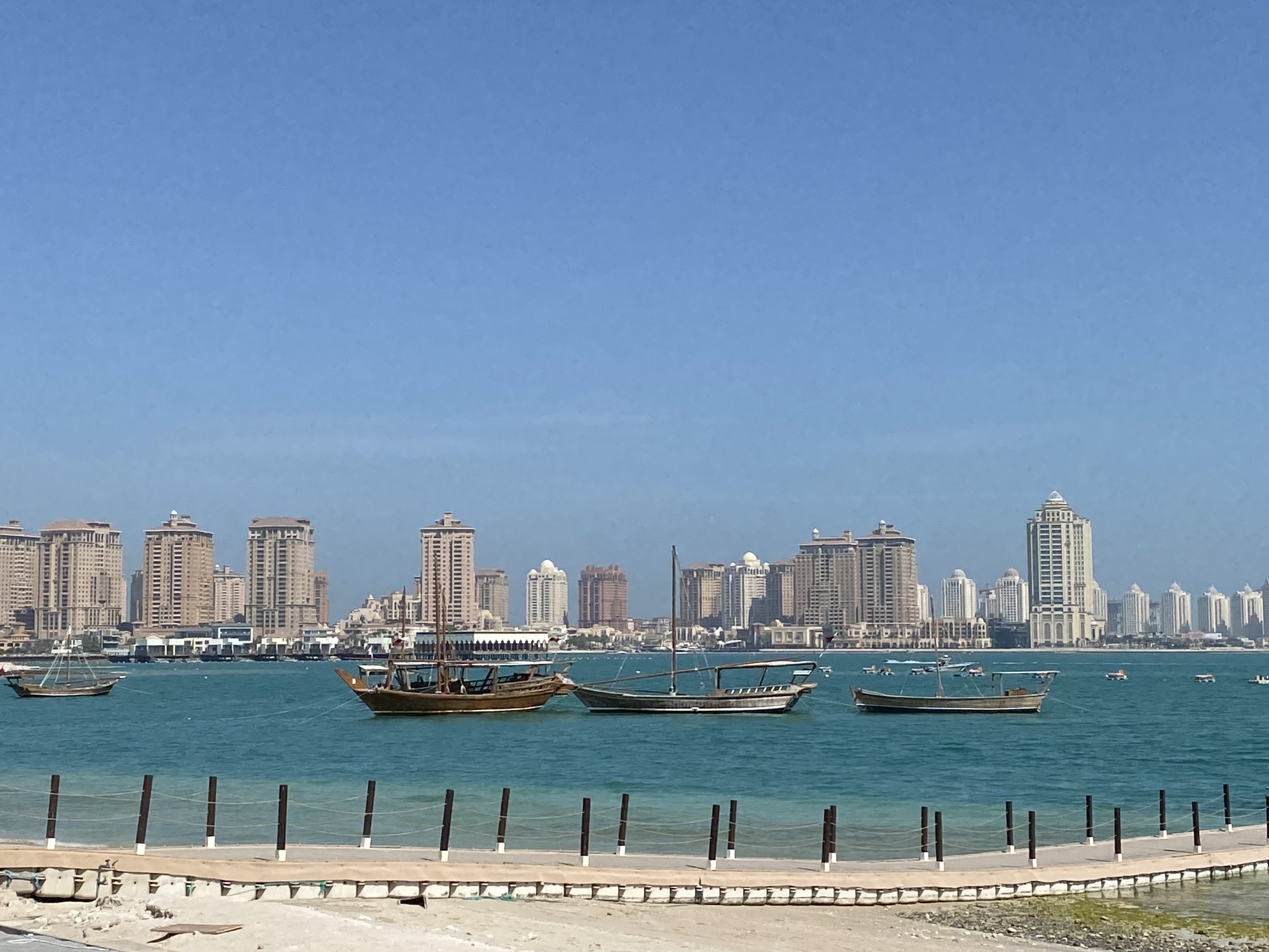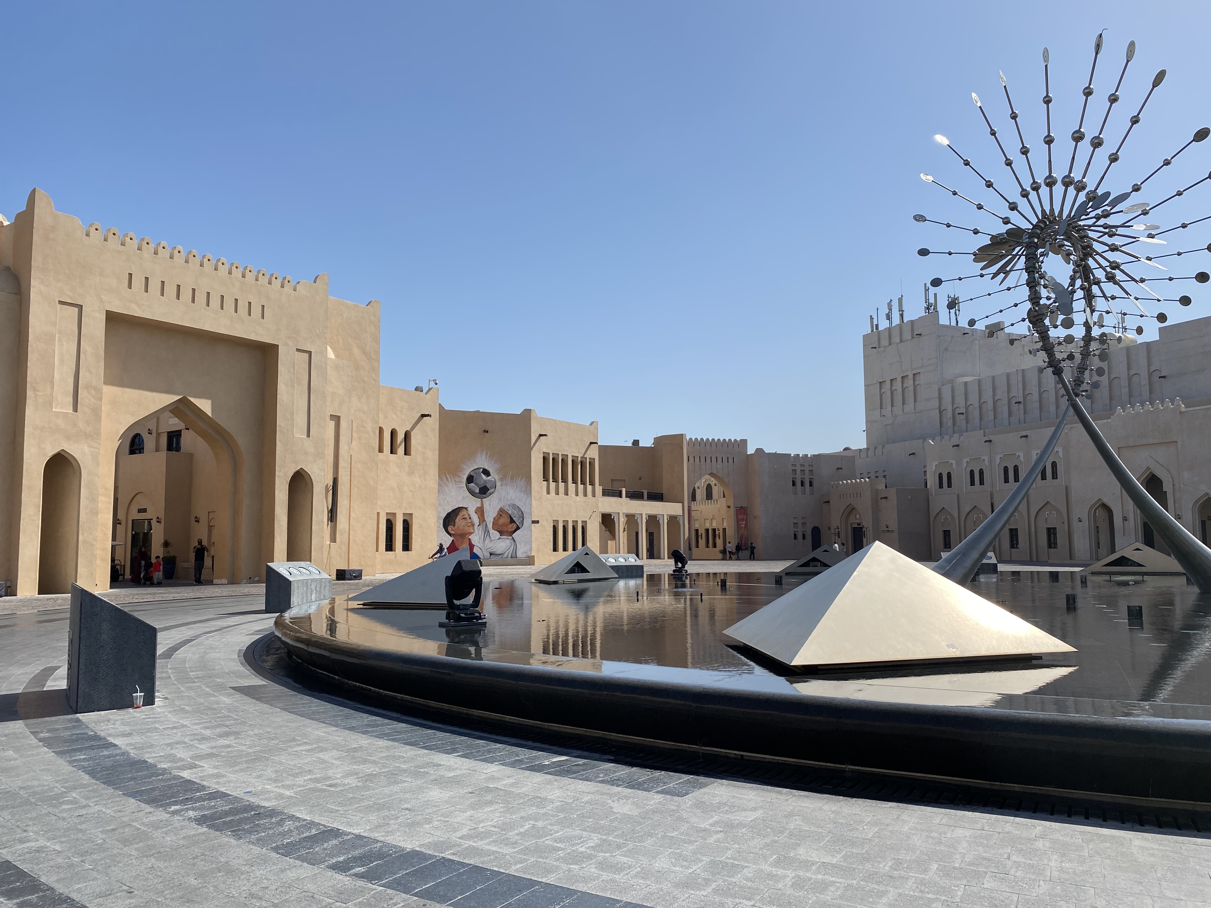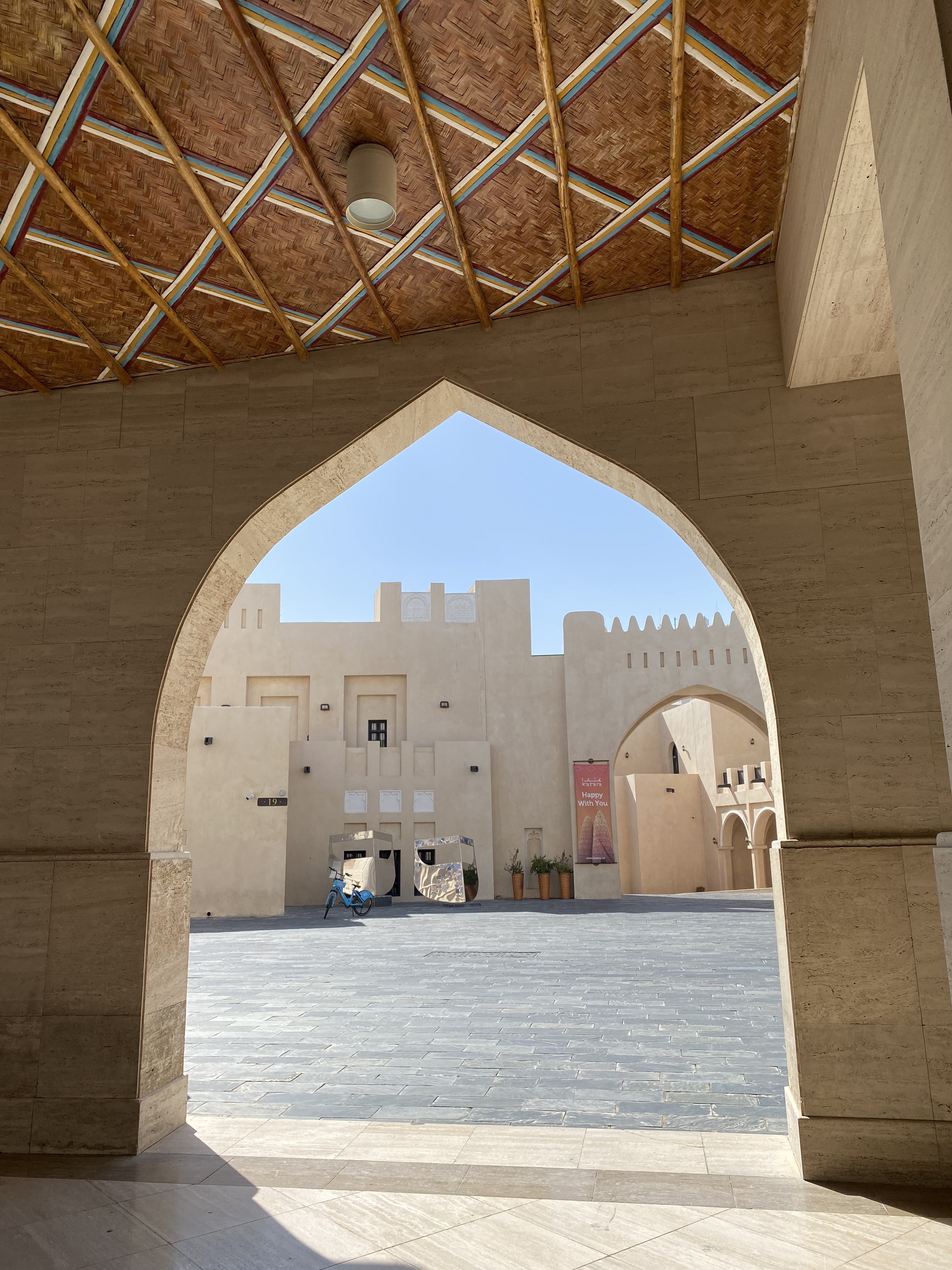 As we wandered through the quiet complex – very few people were around – we found a gallery featuring contemporary art by Middle Eastern artists (several of whom I now follow on Instagram) and a small traditional dhows museum, with realistic models of wooden boats for fishing and trade in the Arabian Gulf. The Arab Postal Stamps Museum displayed World Cup stamps from around the world and several decades. We walked into an outdoor amphitheater, startlingly white and sparse in its interior, and several large empty piazzas. It was all a bit…eerie? But beautiful.