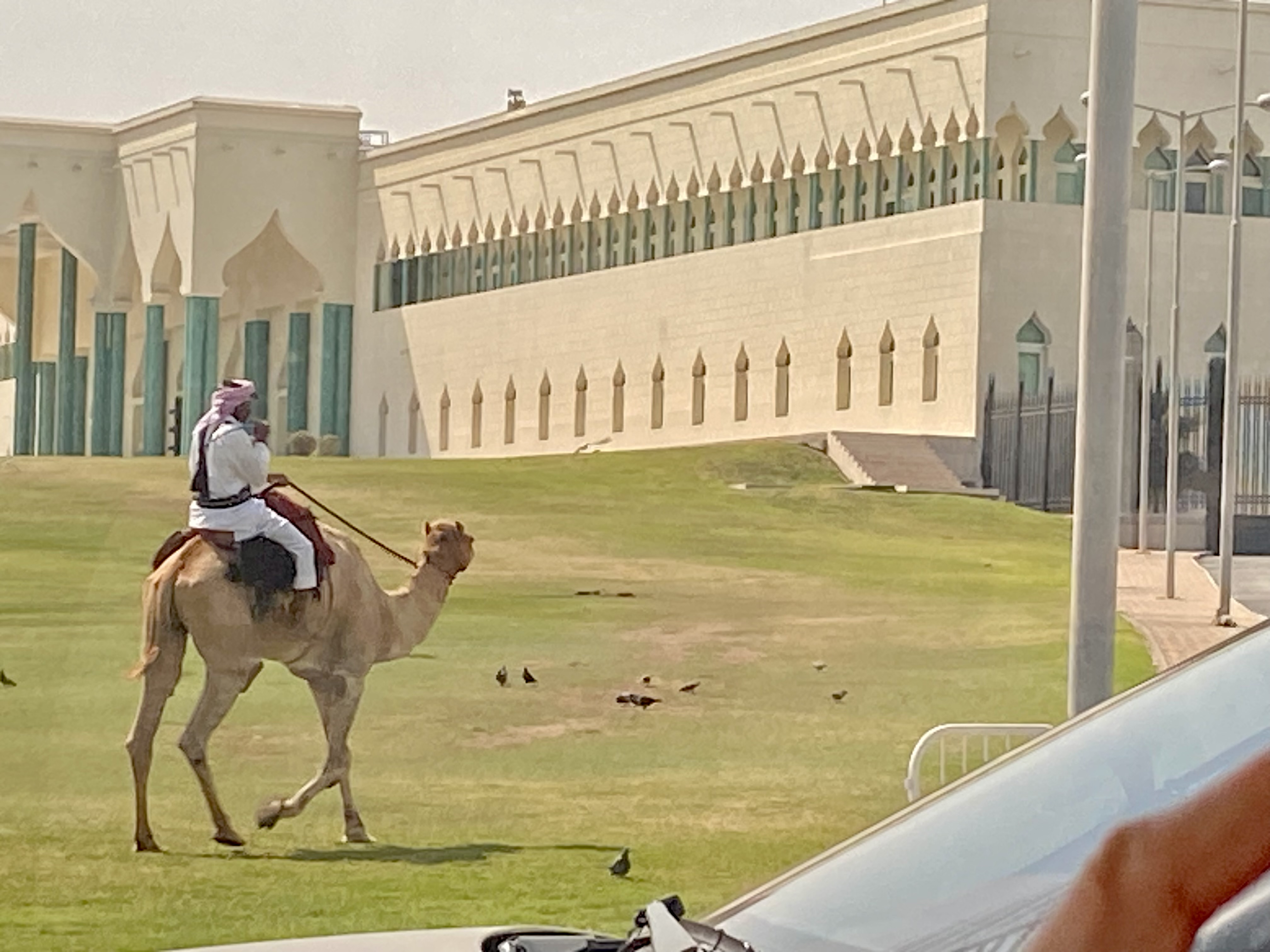 Two days later, on the way to the airport, we had one more gift. As we passed the massive Amiri Diwan building, which is the government office of Qatar’s Amir, the Palace Guard went by on patrol, riding camels. Forgive my blurry pictures: I did my best to zoom in while we sat at a red light.