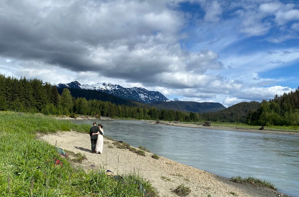 The ceremony was jubilant. The guests trekked out on a freshly made path to a spot along the Eagle River. The groom arrived by kayak. The bride and her brother took the long path together through the meadow to meet the guests. A good friend of the couple performed the ceremony, which took place in front of a naturally sculpted massive driftwood, festooned with banners. We paraded back to the camp for live music, local beer, and a delicious dinner in the rustic lodge accompanied by heartfelt speeches. The love in the room was palpable.