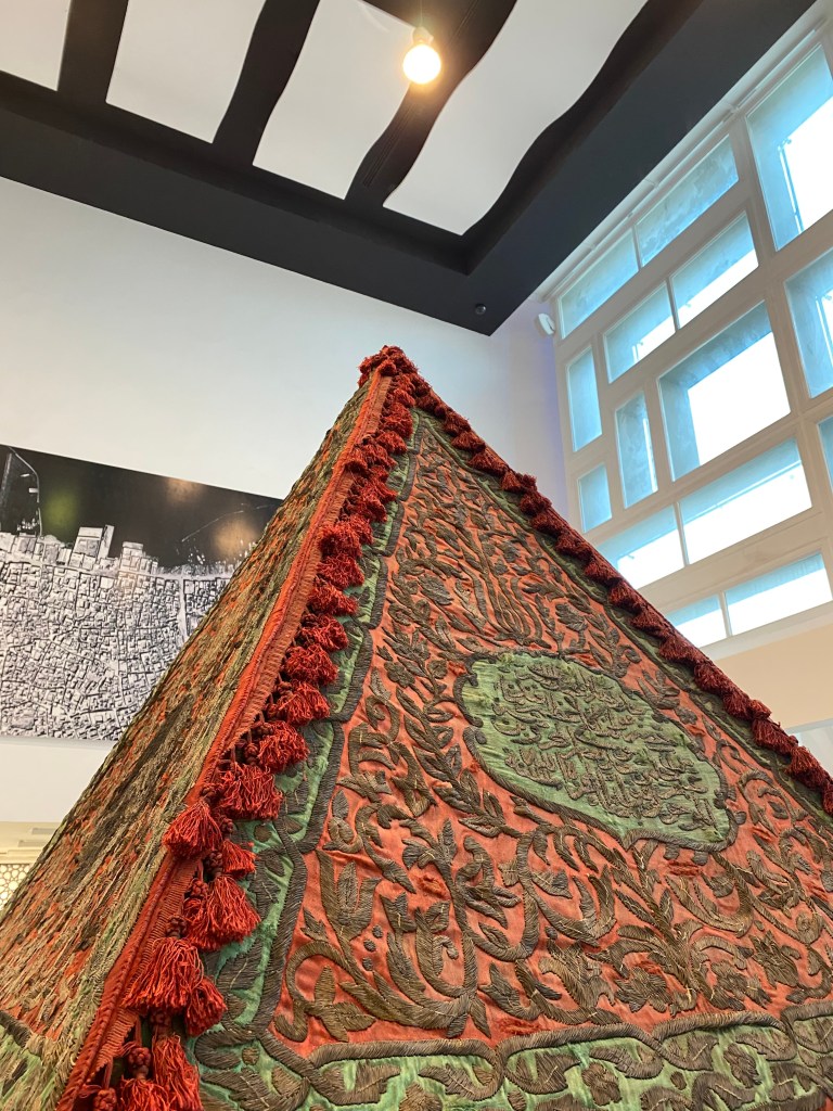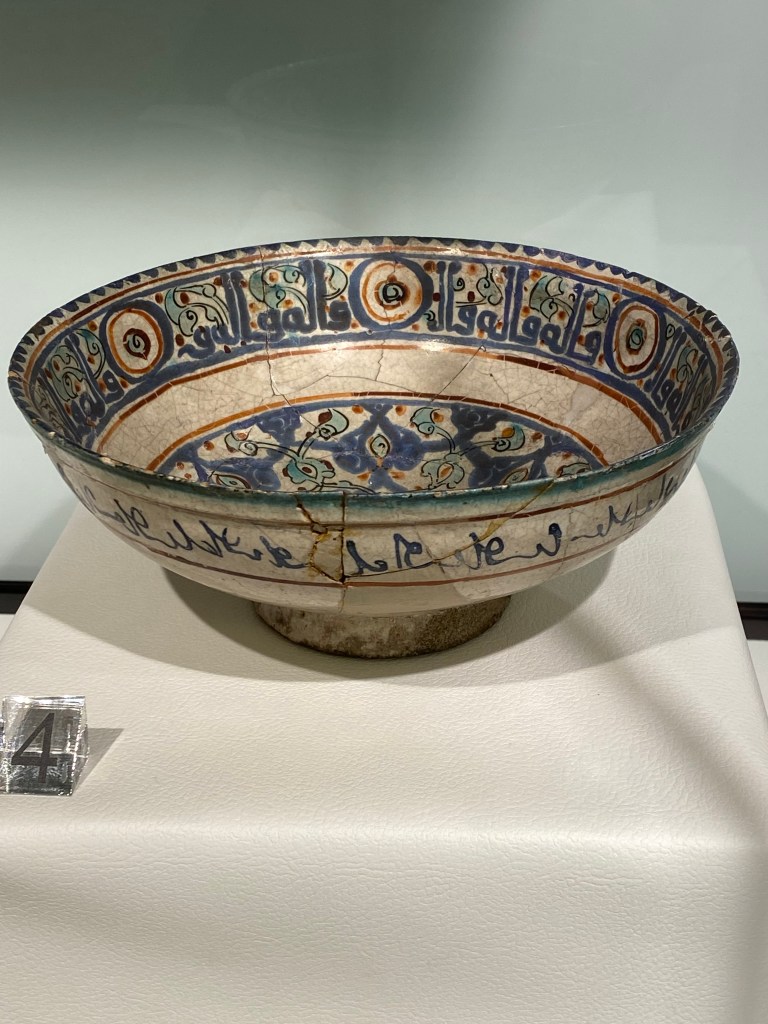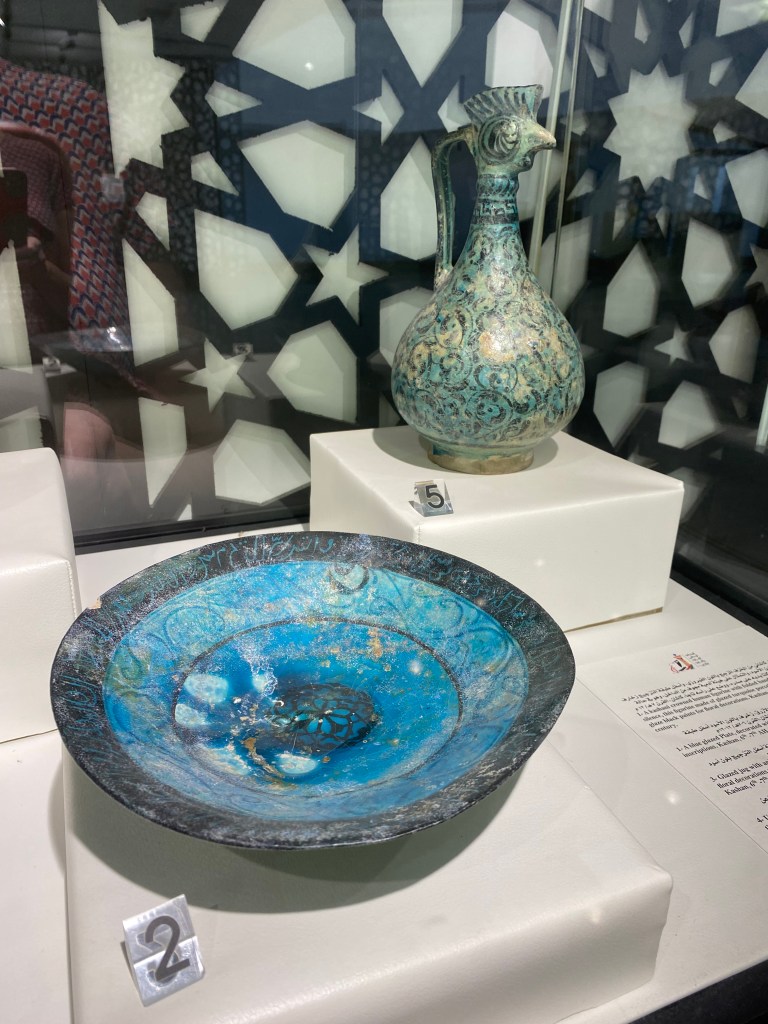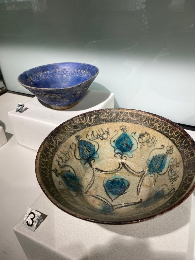 The third and final open gallery displayed stunning examples of handmade Qurans, with precise neat script and pages filled with intricate floral patterns. (Very much like the illuminated manuscripts Christian monks used to produce.) The space also displayed bright and lovely bowls and decanters dating back to the 12th century and heavily carved wooden doors. All very beautiful objects which were a delight to see.