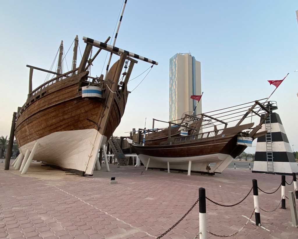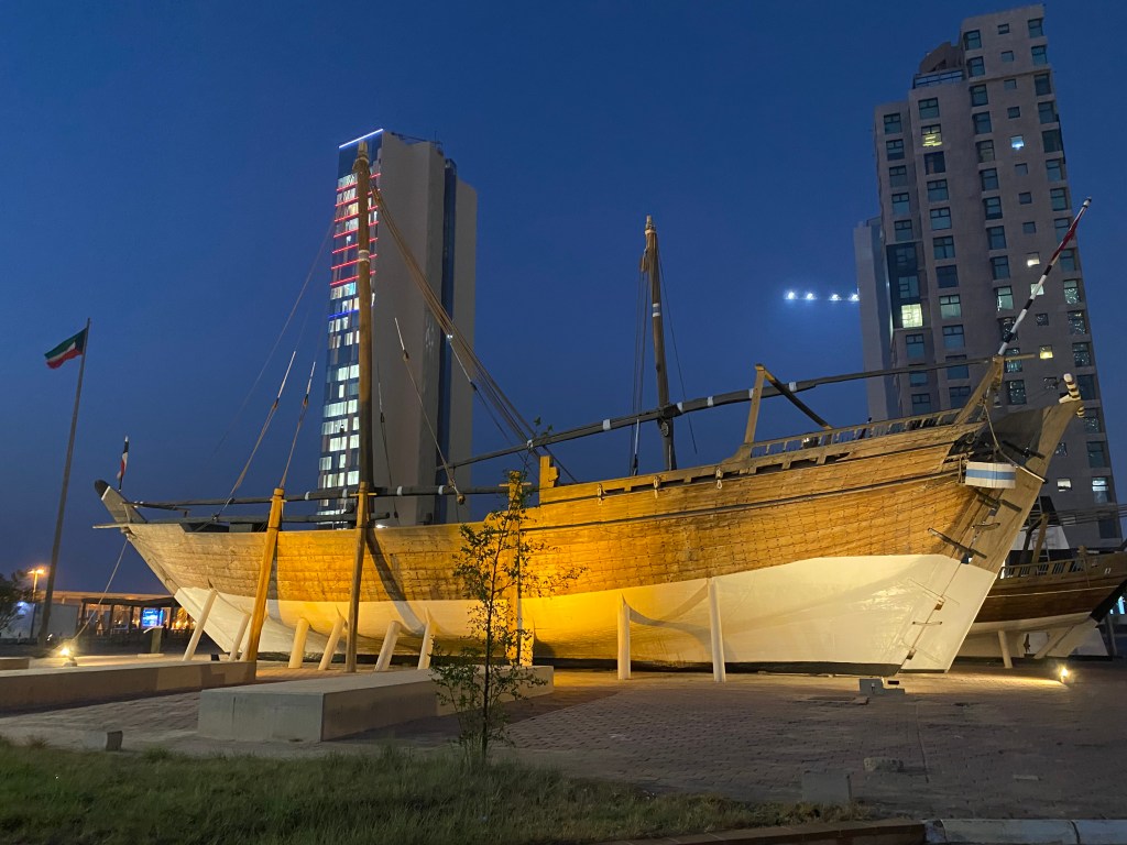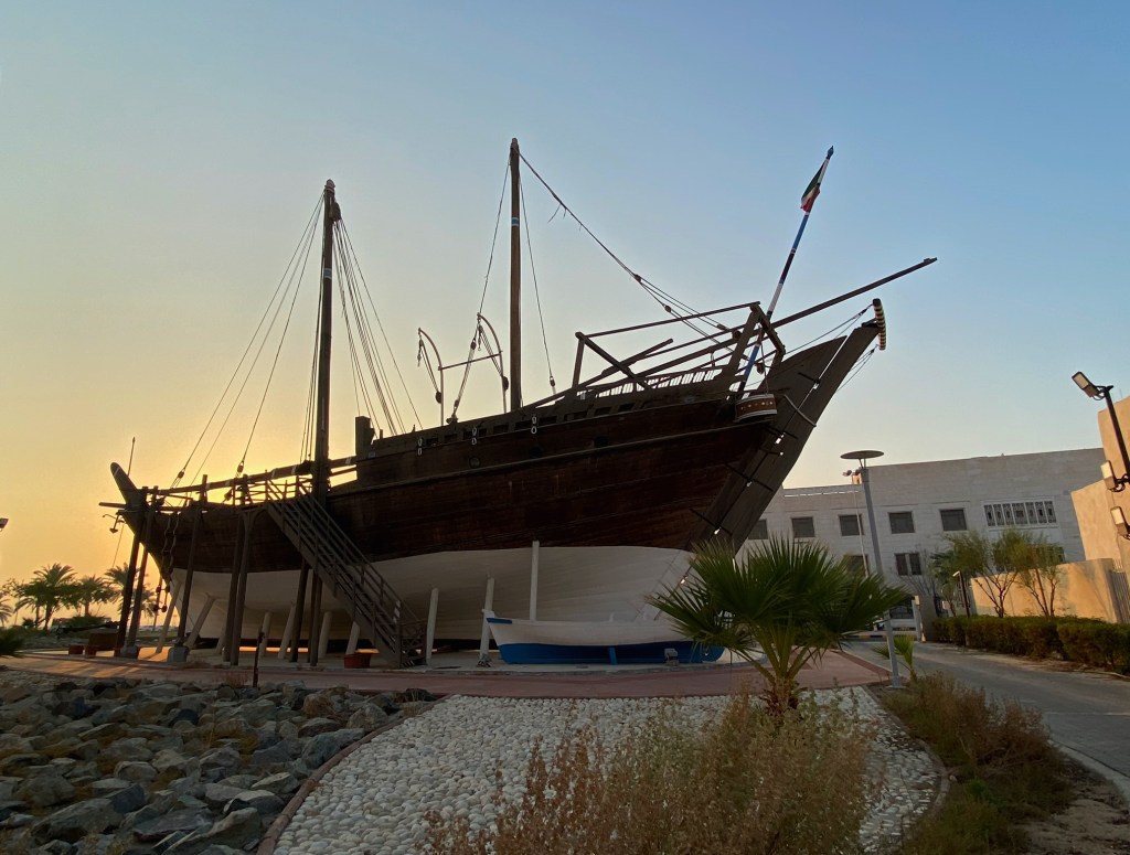 Outside, back in the muggy heat, we walked the length of the museum to view the unusual site of a giant wooden ship, a dhow, dry docked between the museum and the busy Gulf Road. We’d previously driven by but this was my first chance to view it up close. Well, sort of. They won’t let you get very near it. The ship was originally built in 1937 but was burnt during the Iraqi invasion (as was much of the museum) and rebuilt in the mid-1990s as a testament to Kuwaiti culture.