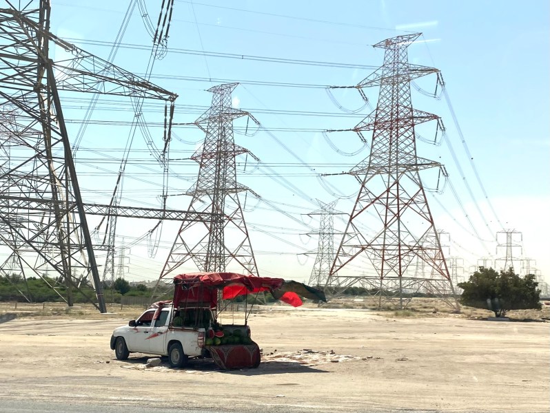 White-robed Bidoon (stateless Arabs) walking the median at traffic lights, selling scarves or head dresses.