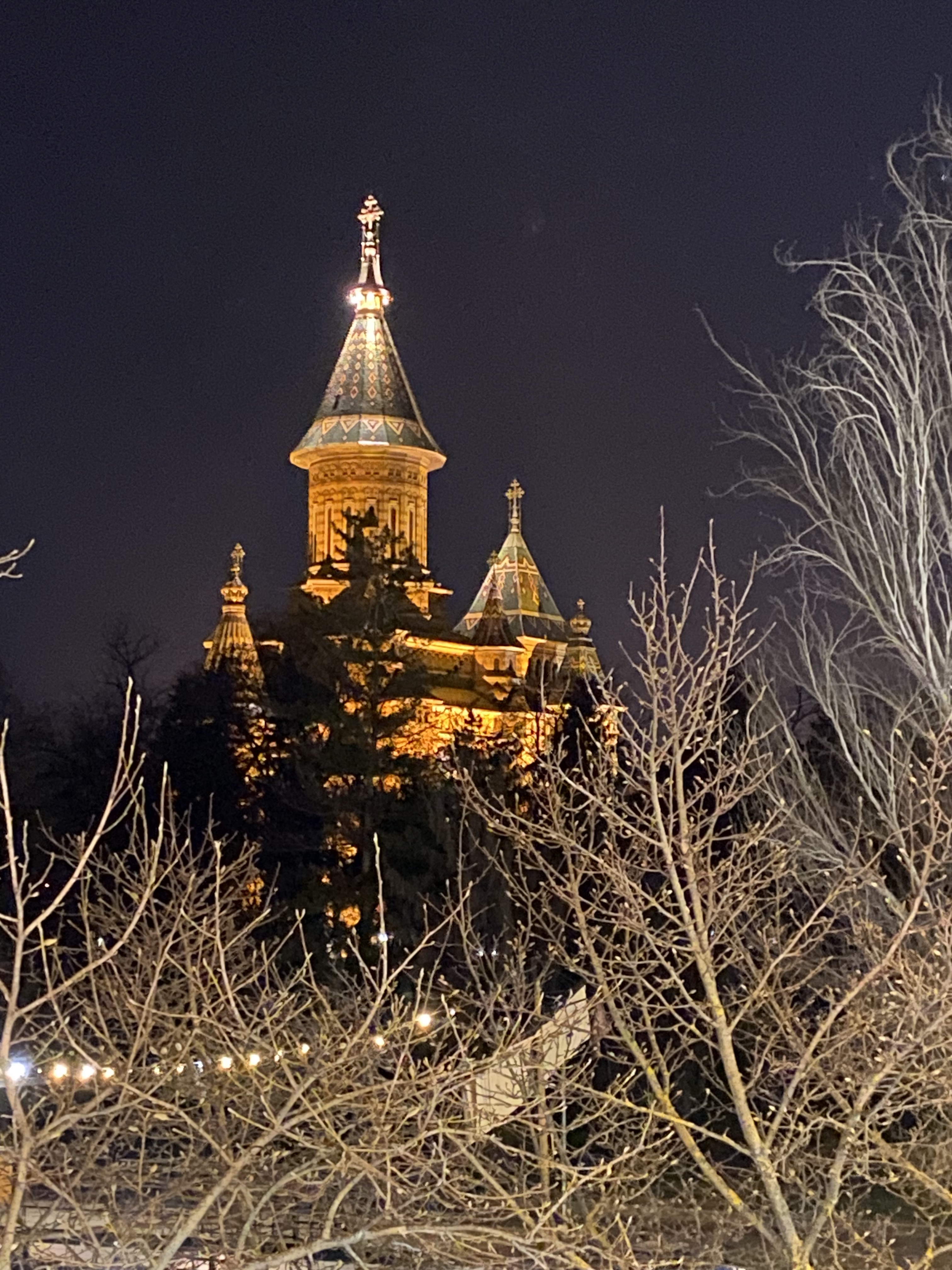 One night in Romania, as we were walking to dinner after a visit to the Communist Consumers Museum, my friend and I fell behind momentarily. Our husbands and sons forged ahead but we were stopped in our tracks by the view of the illuminated Three Holy Hierarchs Cathedral peeking through the trees above us.