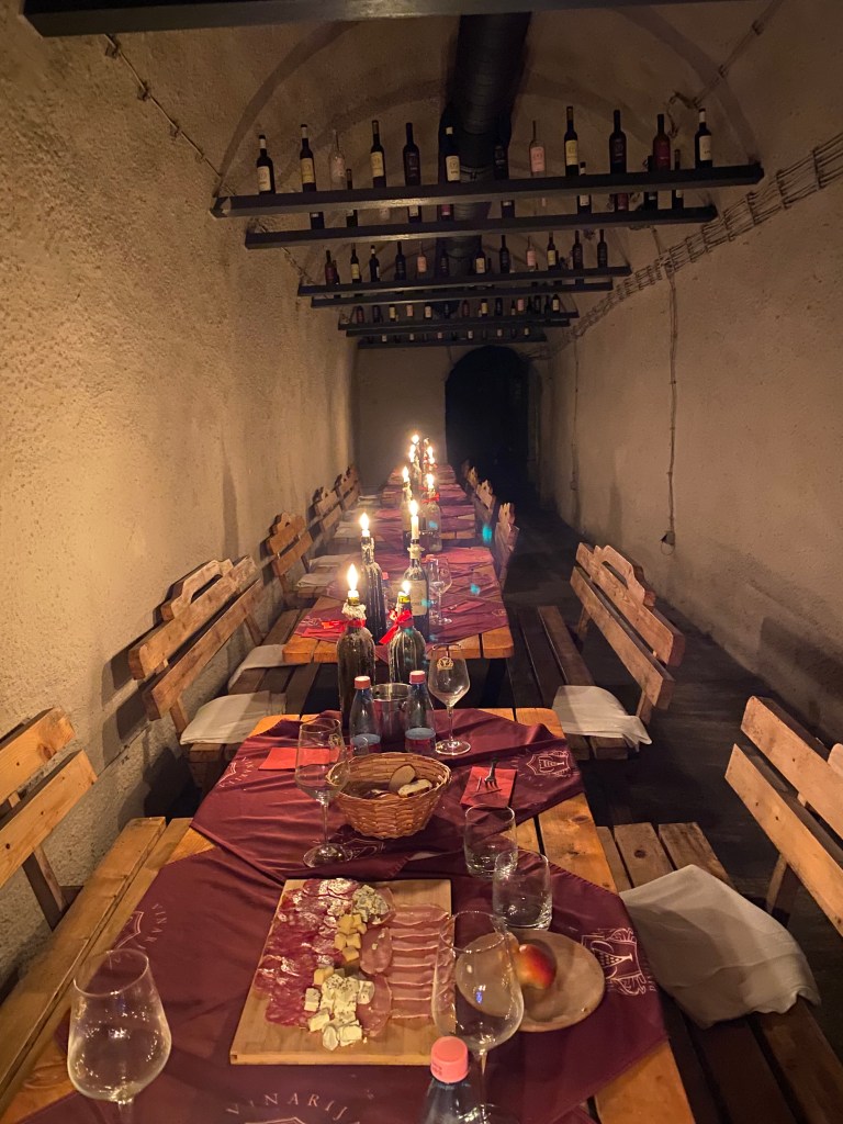 At Panajotovic, you arrive for the tasting on a cobblestone street and enter through a door next to a giant inset wine barrel. Inside, it’s very dark and almost immediately you start heading downward through shadowy tunnels lit only by candles. The tunnels were originally dug by the Romans and have been repurposed over the years, including by Nazis as storage facilities.