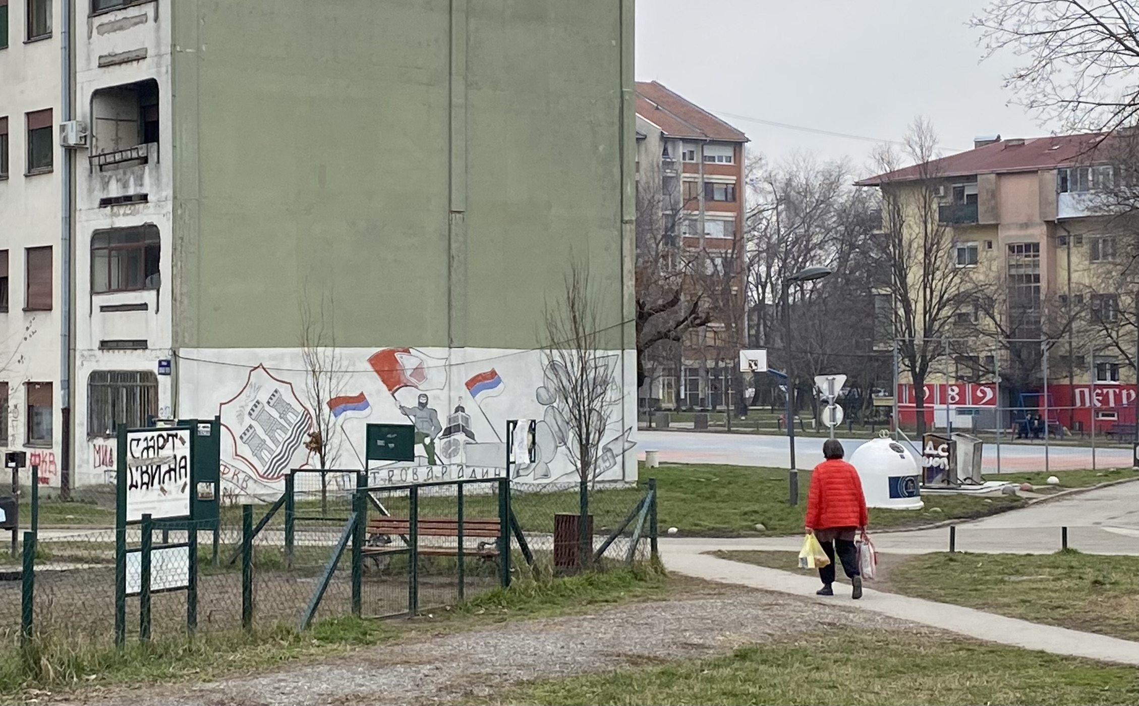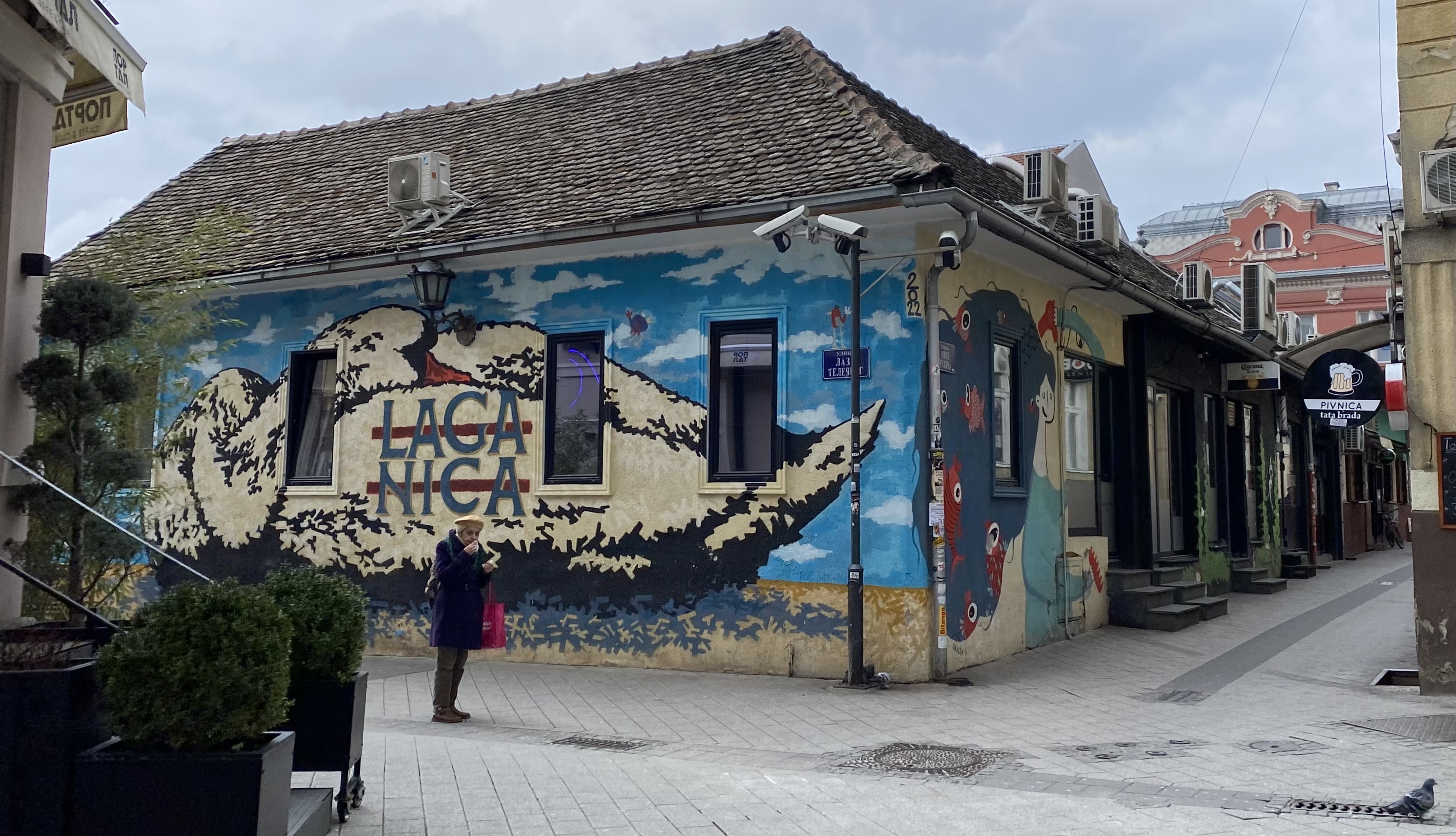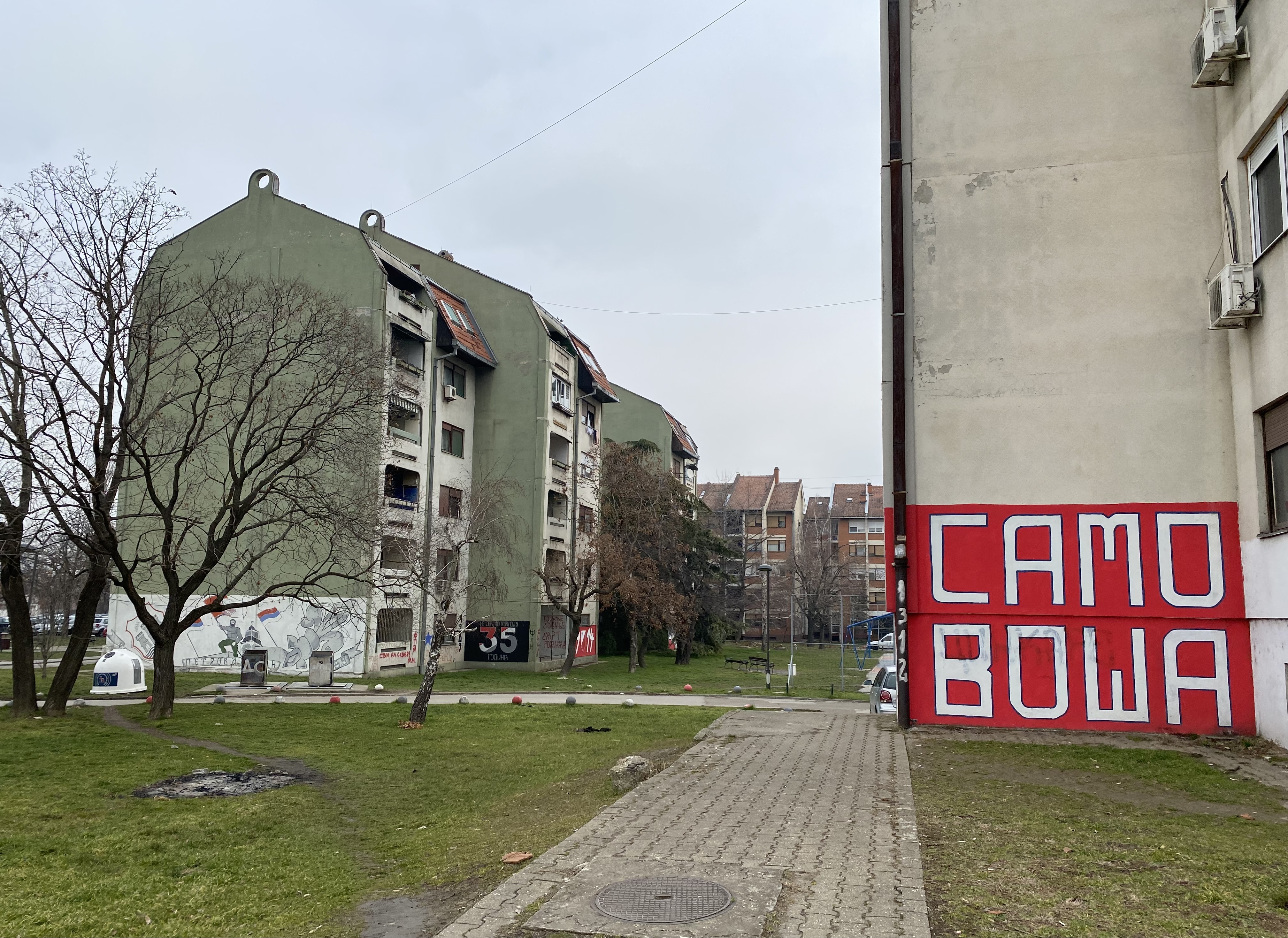 Instead, we walked for roughly 45-minutes through a decidedly non-touristy neighborhood. We walked past small storefronts–bakeries, electronics shops, plumbers, tiny grocers–some marked by graffiti scrawled on their walls. Low cottages skirted the street in clusters connected by walls with closed pedestrian and car gates. We passed a number of five-and-six storey apartment complexes with bus stops out front. On the wall of one apartment building, a mural featured men in ski masks holding up Serbian flags and a flag I couldn’t identify, and featured a large crest of Novi Sad. I can take guesses at the murals’ meaning, but again, even trying to be an informed visitor is difficult with political histories as fraught as the nations within the former Yugoslavia.