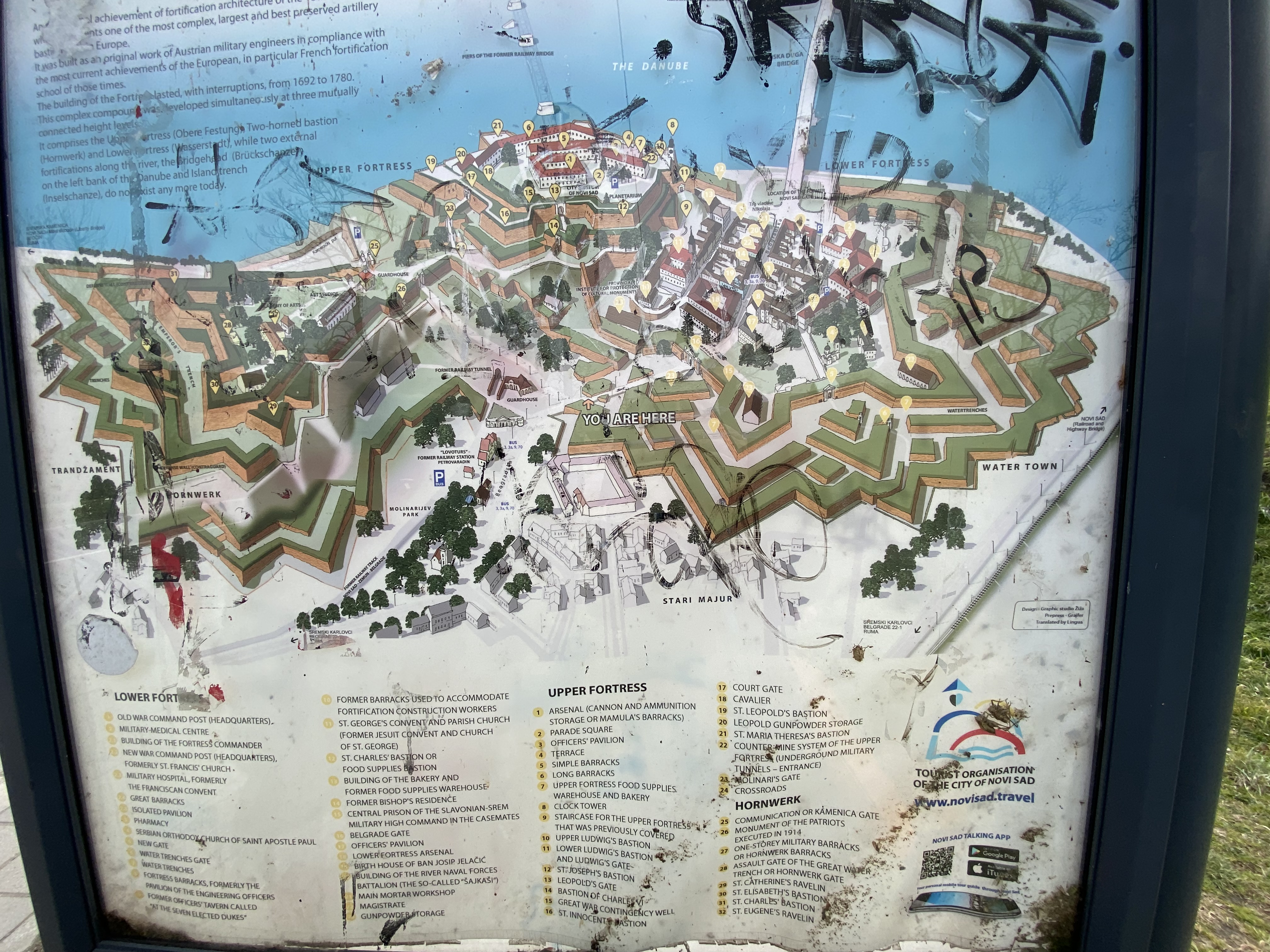 Eventually, we arrived at the outer grounds of the fortress. Prehistoric settlements have been found on the site, with more recent occupants including the Celts, the Romans, and the Austrian-Hapsburge empire. The current grand structure dates back mainly to the 18th century. My American readers most likely will not, but Europeans may know the fortress as the site of the annual EXIT music festival.