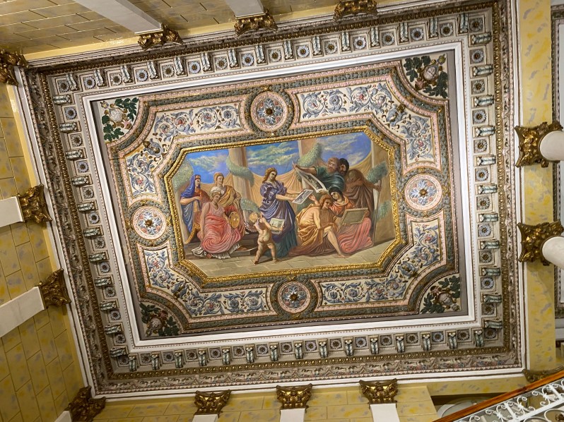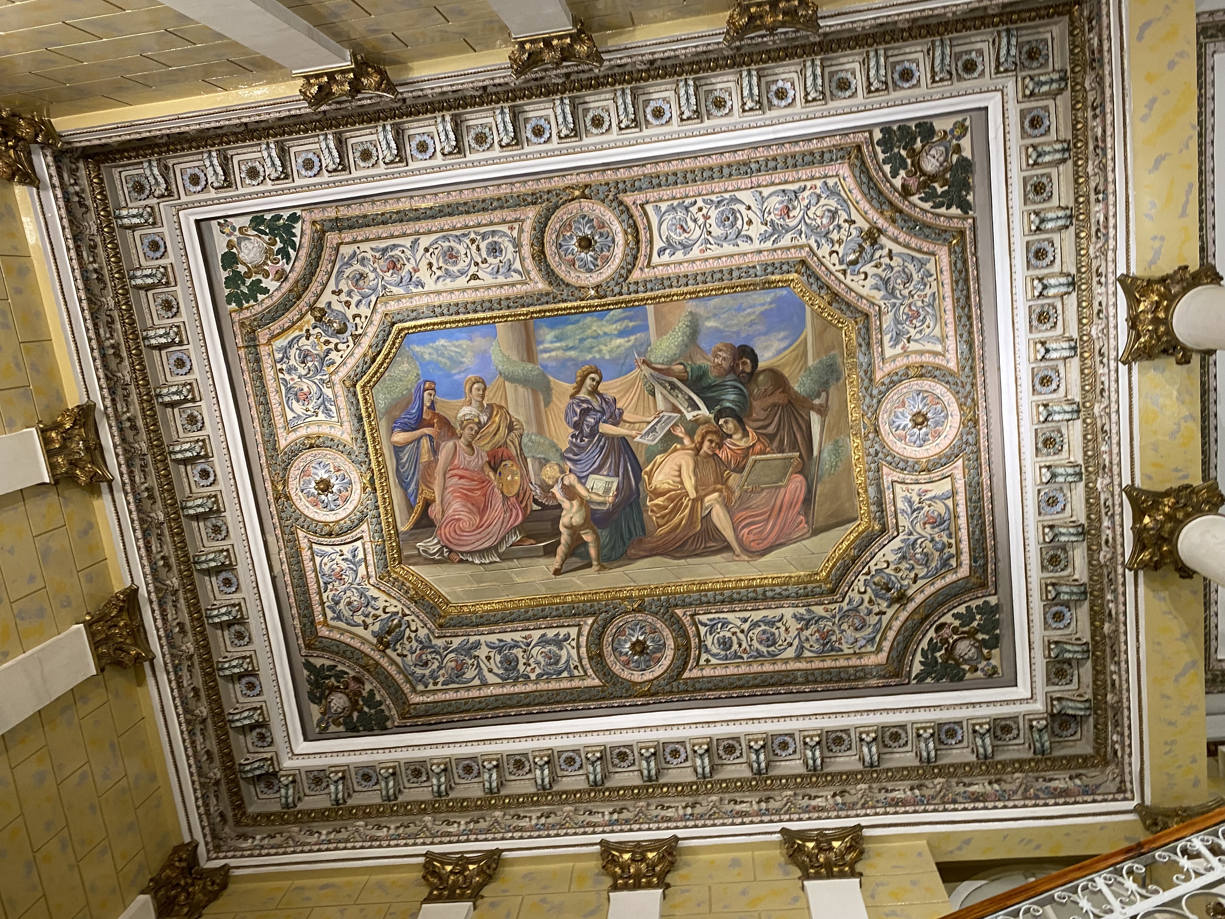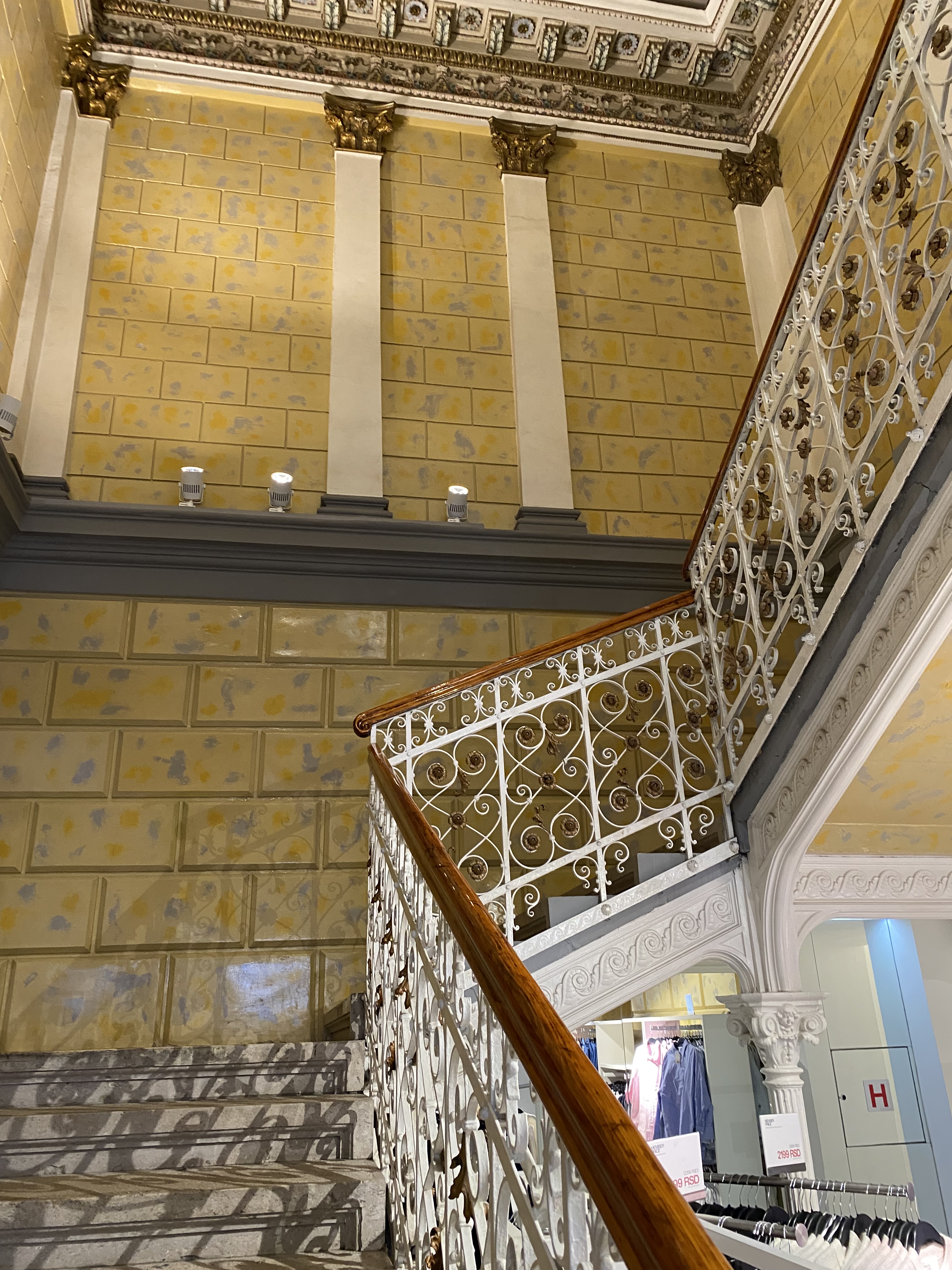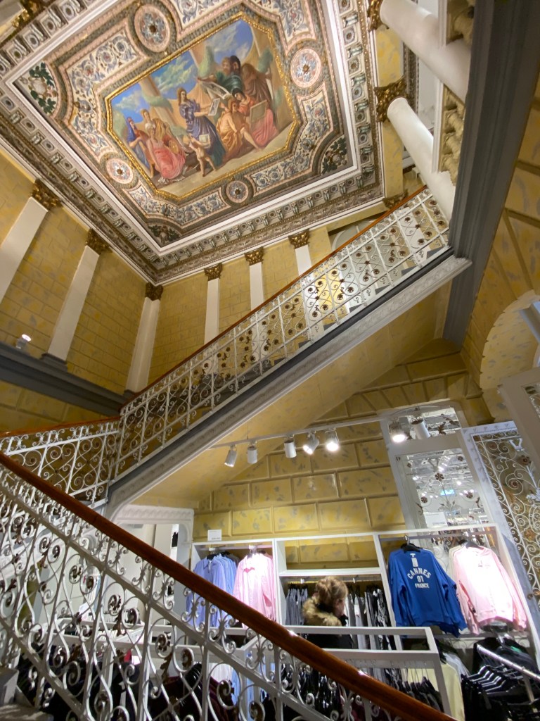 We also went into one of the most beautiful H&M stores in the world. Occupying two stories of a 19th century palace, original flourishes remain, including an ornate ceiling fresco in the stairwell. Cherubs and cheap sweaters are on view. It was a day of being followed – somehow our group attracted the interest of the store’s security guard, who kept a wary eye on us both downstairs and upstairs.