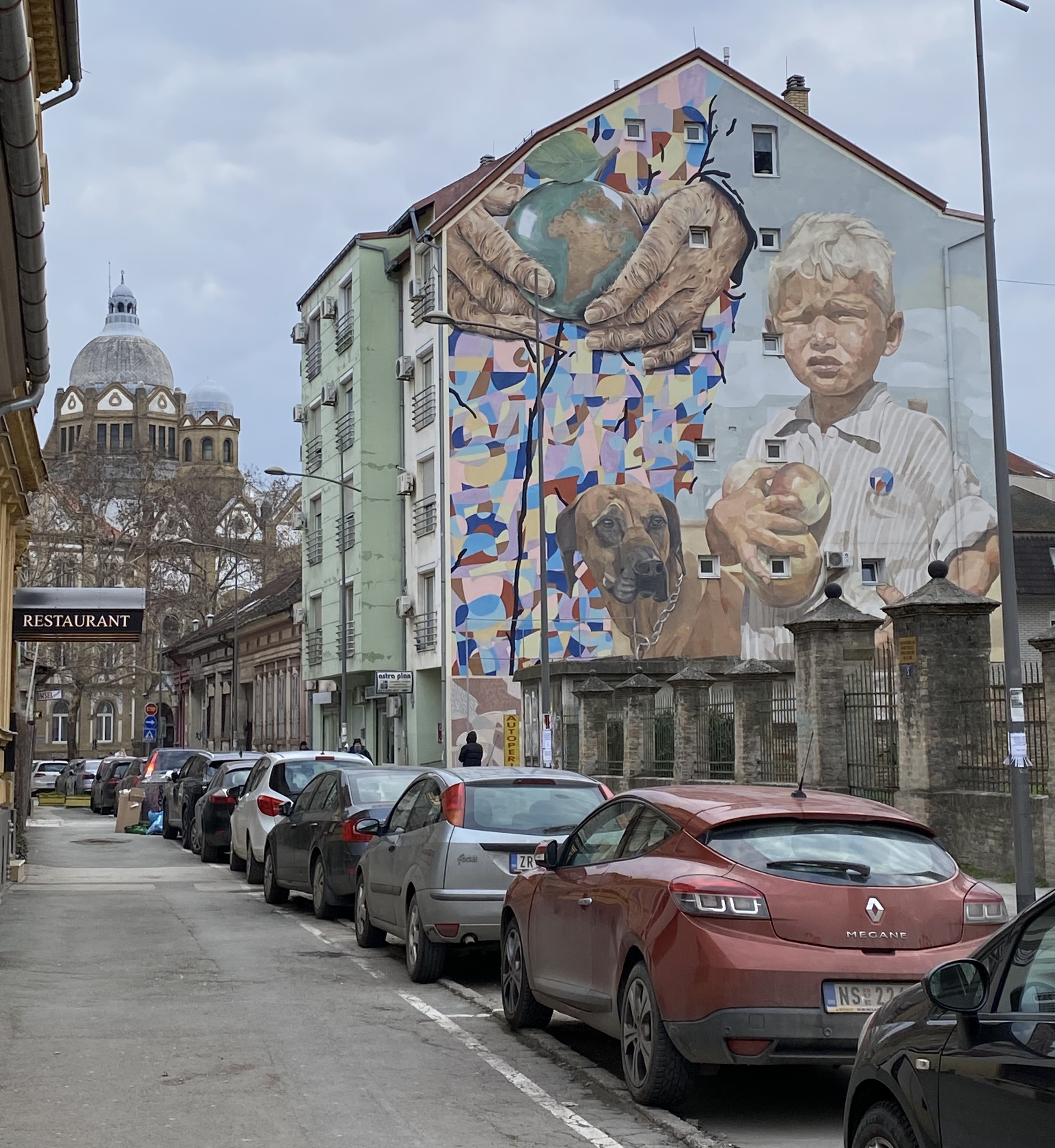 At the end of the day, on our ill-advised trek through the city to the closed station, we spotted a few of the modern murals which Novi Sad is also known for, including this one of a very confused boy eating an apple.